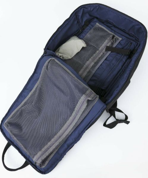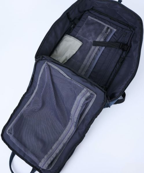 縦開きタイプ。左右対称の前面ポケットがアイコニックなデザインの大容量マルチリュック。2泊分の荷物も仕分けして収納可能。内生地撥水のドリンクポケットですっきり収納。荷物が少なくても自立する設計。