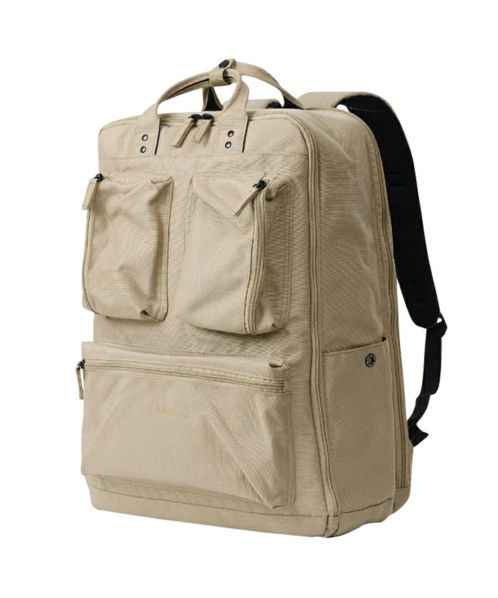 縦開きタイプ。左右対称の前面ポケットがアイコニックなデザインの大容量マルチリュック。2泊分の荷物も仕分けして収納可能。内生地撥水のドリンクポケットですっきり収納。荷物が少なくても自立する設計。
