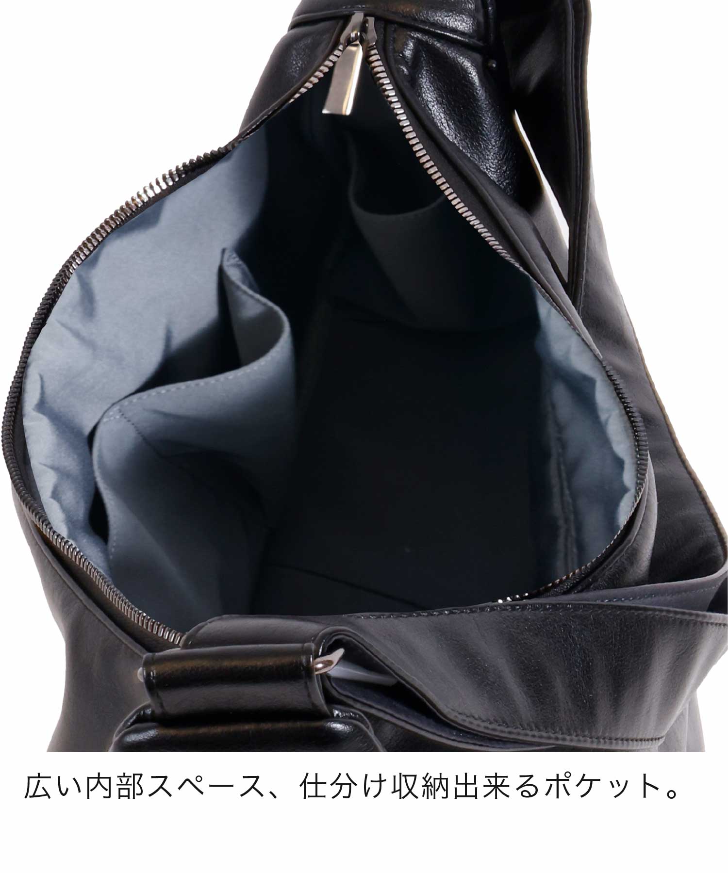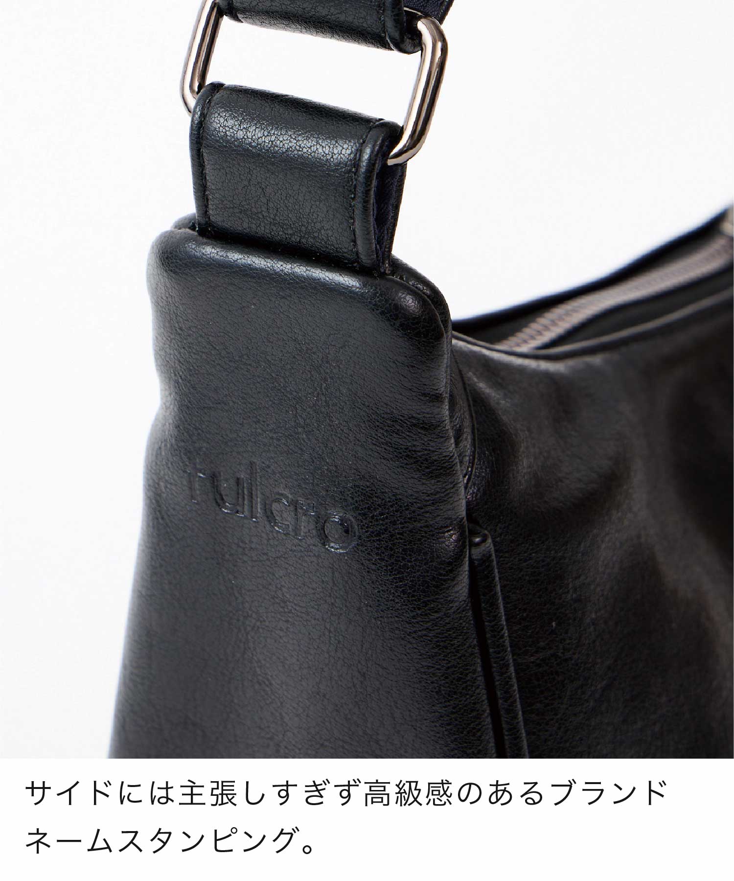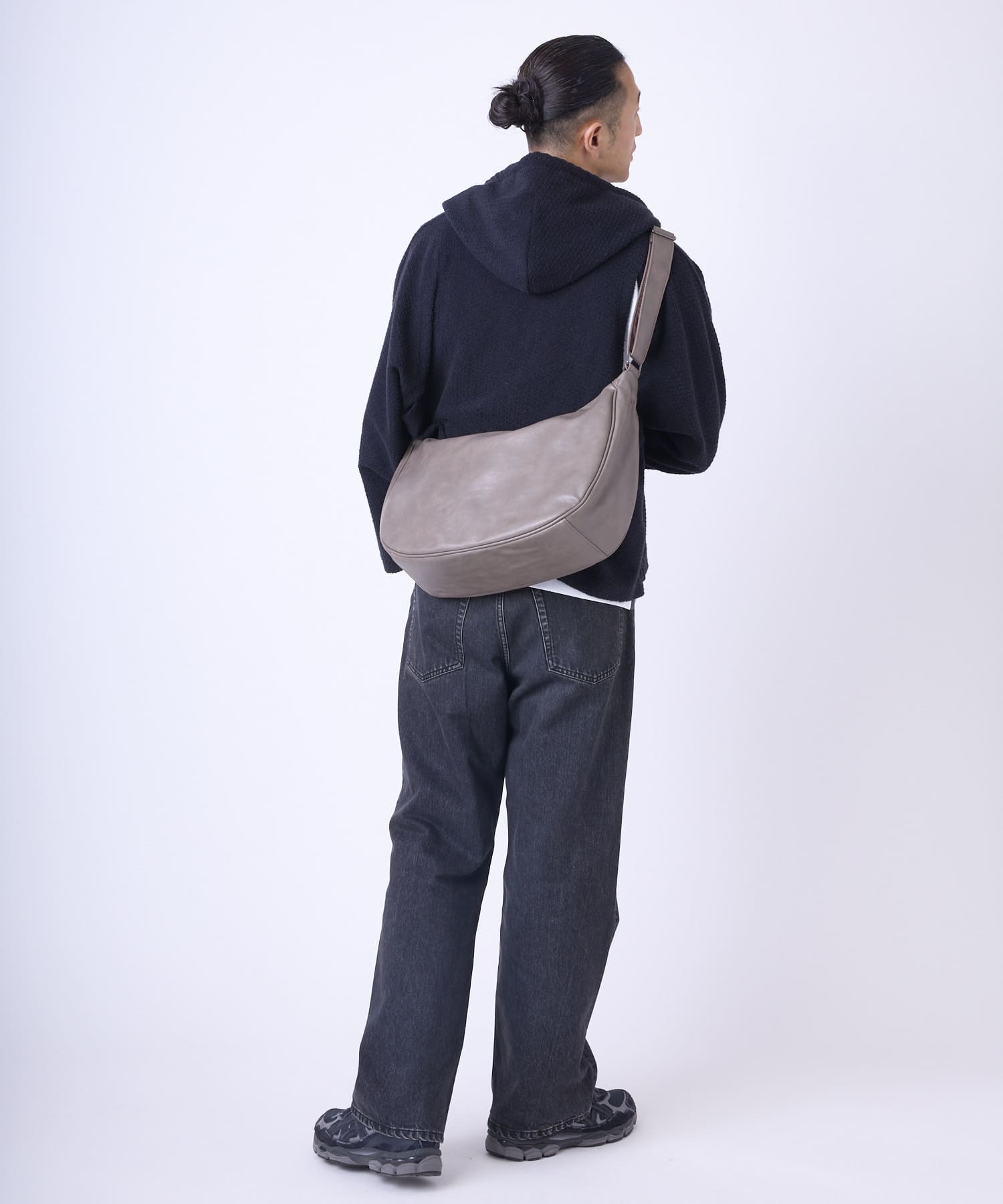 バッグの持ち手から本体までの流れるようなラインデザインで、肩から掛けた時でも形を崩さず身体に美しくフィットする。 皮革のような雰囲気でいて撥水性が高くシーンを選ばない。 マチが広いことで収納力が高く、自立する設計になっているので使用していない時でも存在感を発揮する。