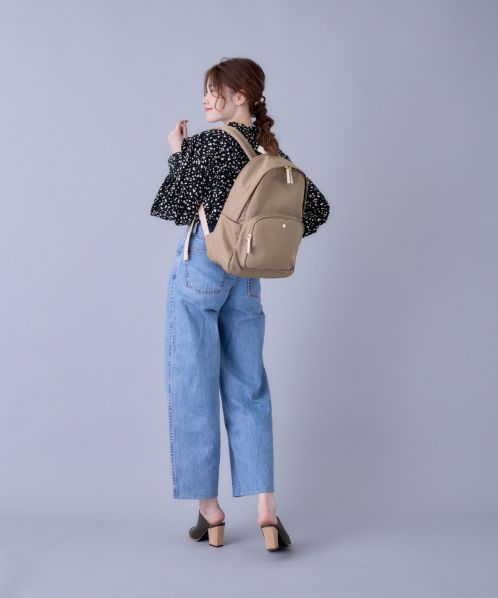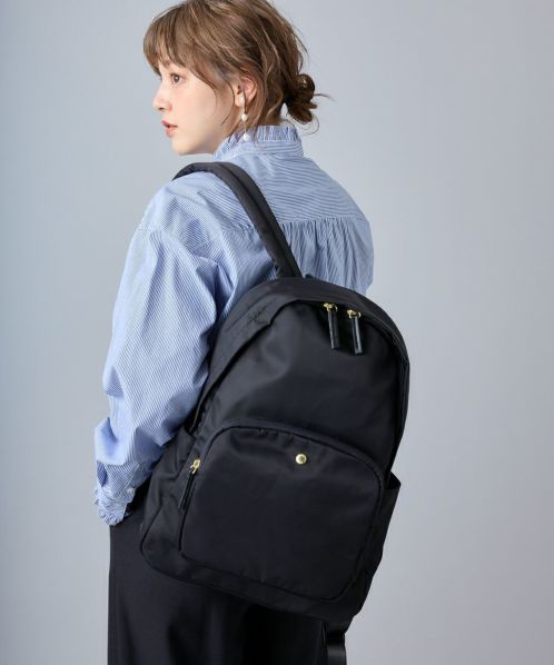 肩の負担を軽くするために、ショルダー内のクッション材にこだわりました。また、体に近い面(背面側)に13インチのPCが収納ができる専用ポケットを設置。背面の腰回りにクッションも入れ、より体のラインにフィットしやすくしました。ポケットも10個あるので、使い勝手も抜群。嬉しい撥水加工で、雨の日でも安心です。A4サイズもしっかり収納できるので、通勤や通学にもオススメの一押しリュックです。