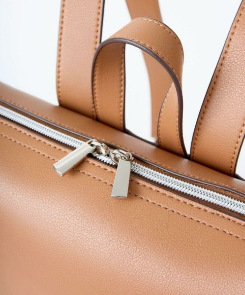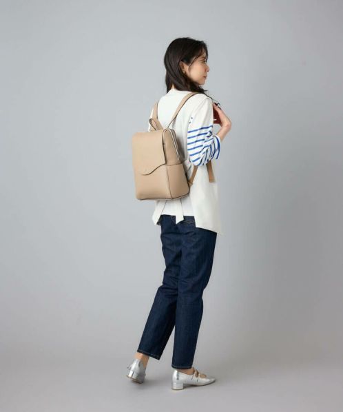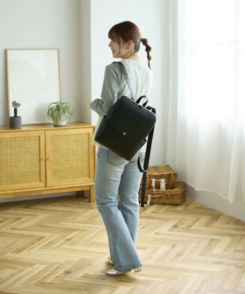 「え、かるい!」と、思わず声をあげてしまう軽量感。高級感と落ち着きがあるのでカジュアルコーデにこのバッグを合わせるだけで一気にきちんと感が出ます。重くて敬遠していた合皮のリュックも、これなら可愛いくラクラク!ほどよいハリとやわらかさがあり、本革のようなしっとりとした手触りです。