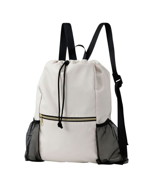 軽やかに持てる撥水ポリエステル生地のベーシックなバッグ。ハリのある生地とゴールドの金具が高見えする上品なシリーズ。撥水機能つきで雨の日やお子様と水場で遊ぶ際なども安心。内生地は明るめの配色なので、バッグの中の荷物が見やすいのが特徴です。トレンドのナップサック型リュック。ショルダーは幅広めに設定しており肩に優しい仕様。ポケットは5箇所あり、両サイドのポケットはペットボトルや折り畳み傘が収納できます。折りたたむこともできるので、旅行などの荷物の多いシーンにも活躍するアイテムです。