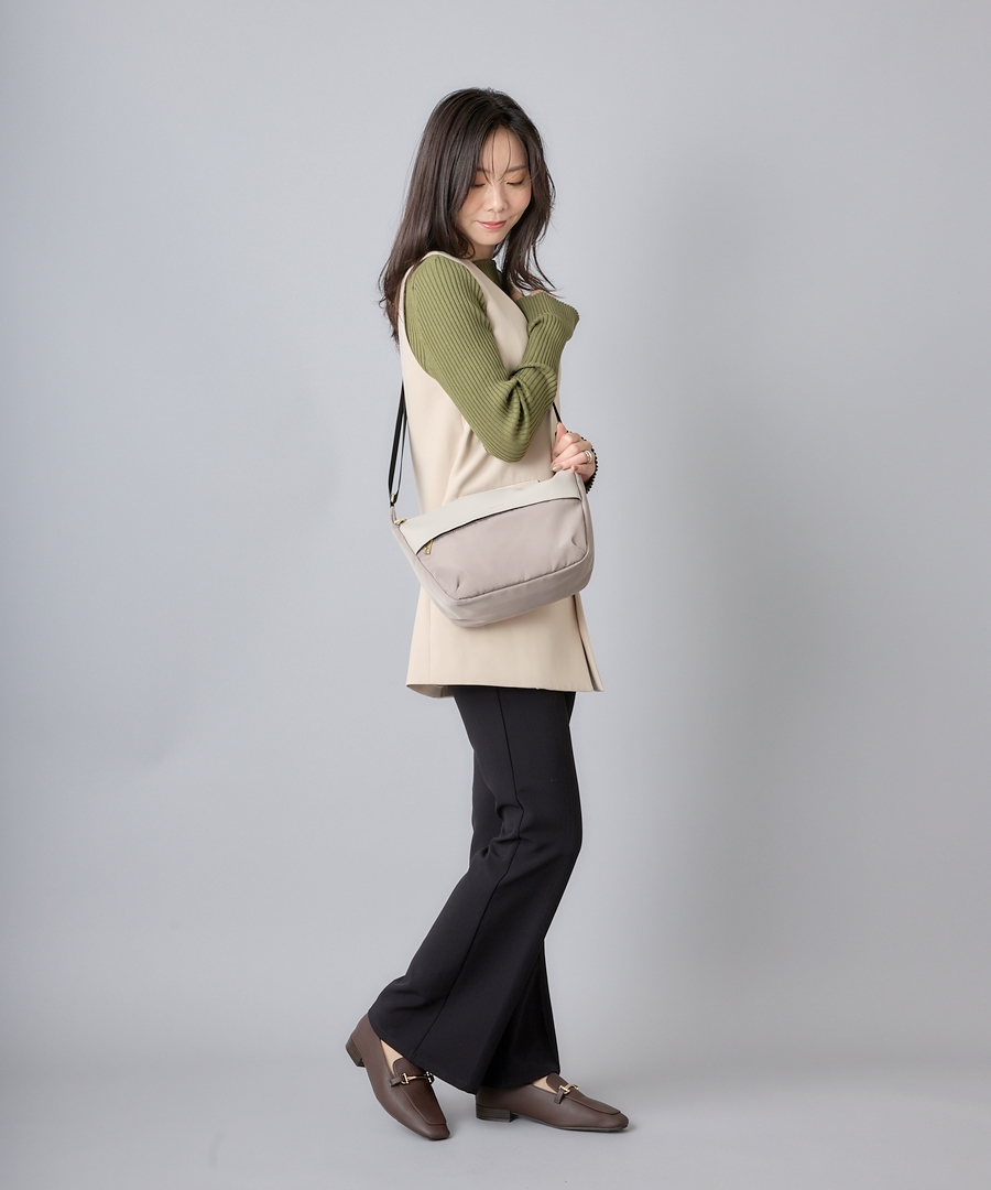 上品な光沢感のあるポリエステル素材とシボが型押しされたフェイクレザーの組み合わせが大人の雰囲気◎長財布とペットボトル+αもしっかり入るのが嬉しいポイントです。撥水加工なので雨の日のお出かけも安心。