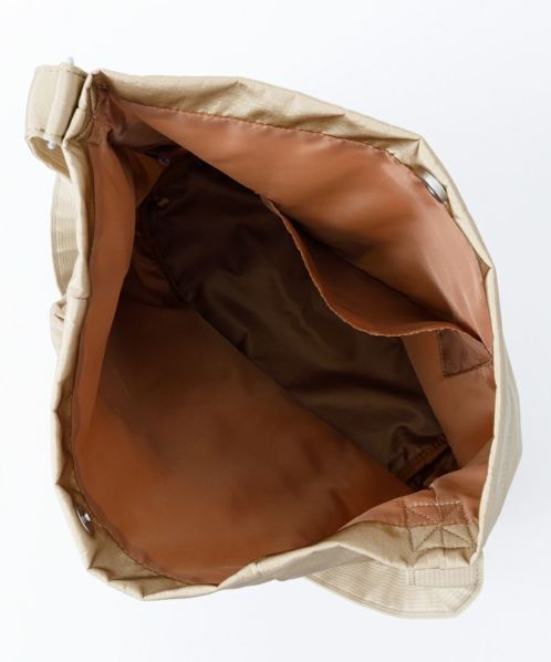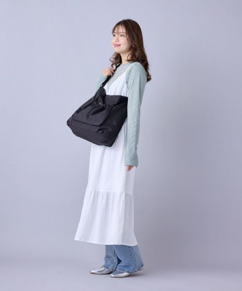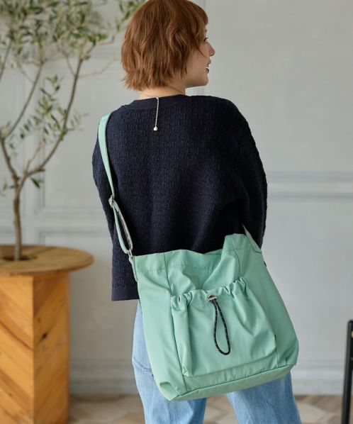 くしゅくしゅとしたフォルムが可愛い、トレンドのドロストポケットがポイントのカジュアルなシリーズ。生地はシャリっとした張り感と光沢のある撥水素材を使用しております。柔らかく軽量で、機能性もバッチリ◎ガバッと大きく開く開口部とサイドのファスナーポケットが特徴。A4サイズが収納可能で通勤・通学などに便利です。