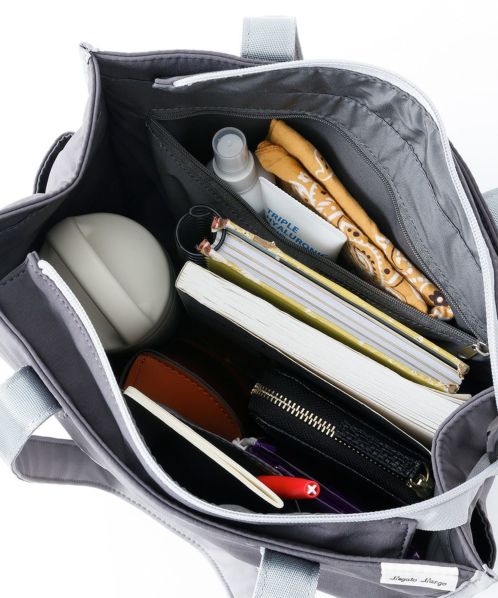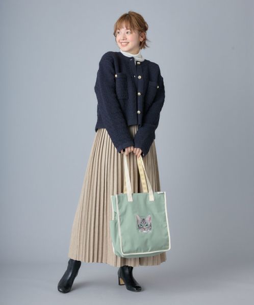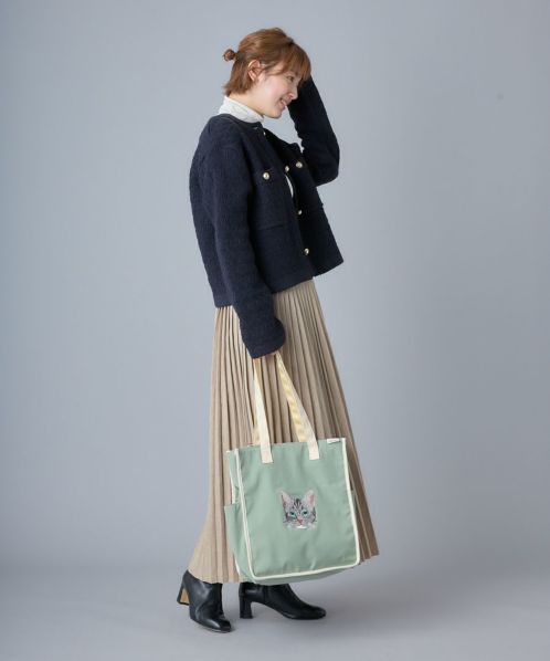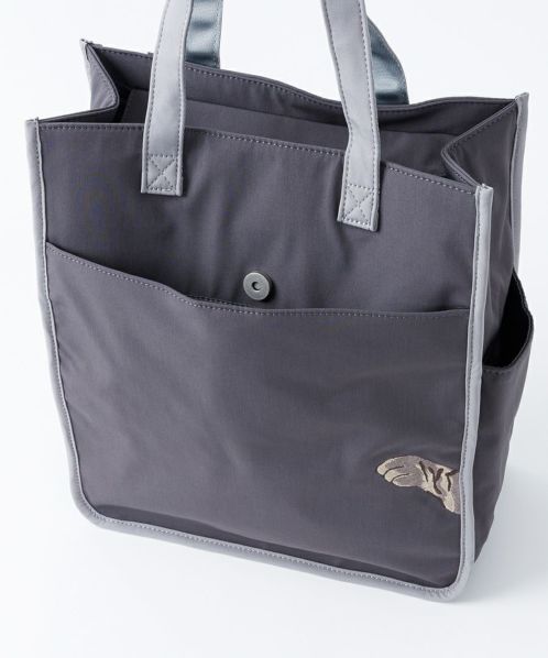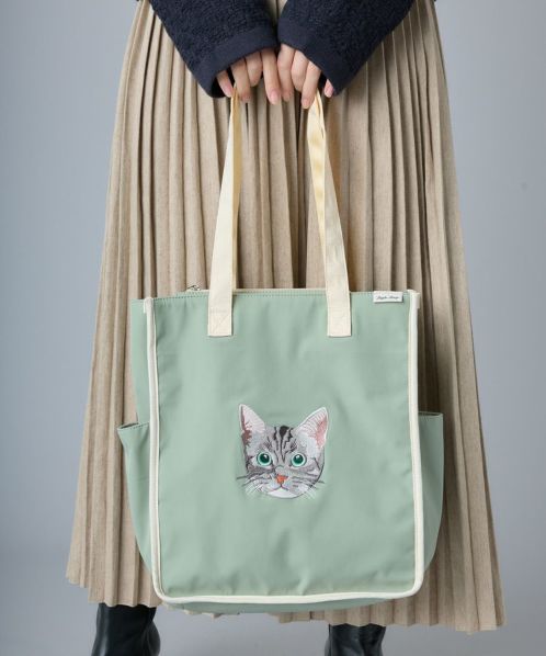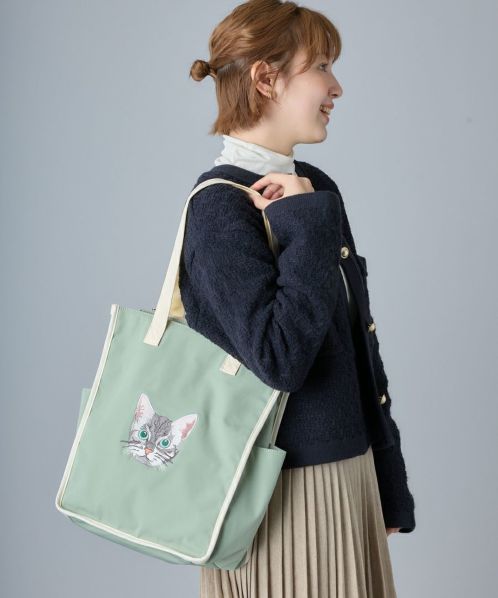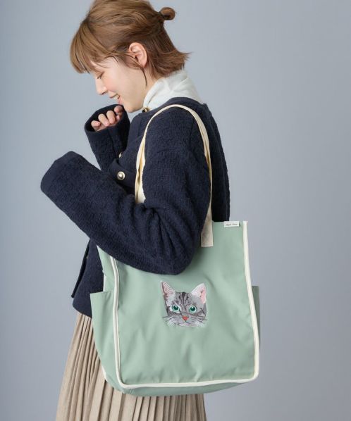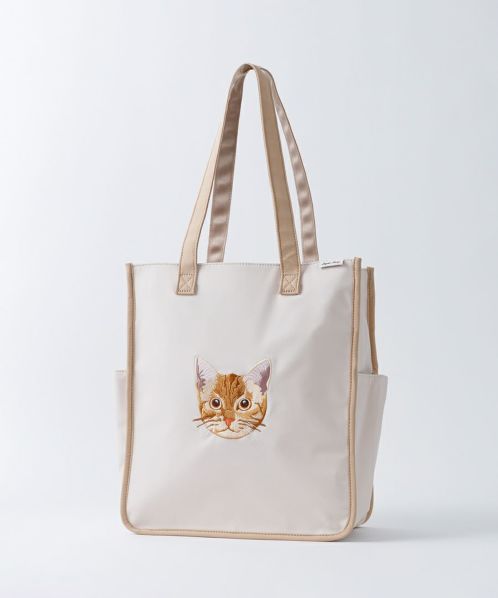 オリジナルの猫モチーフの刺繍が魅力のシリーズ。背面は猫の手がひょっこり現れる遊び心のあるデザイン。手触りの良いコットン調の生地もポイントです。A4の資料が縦に入るサイズのトートバッグ。サイドと背面、内側に5つのポケットが付いた機能性の高いアイテムです。