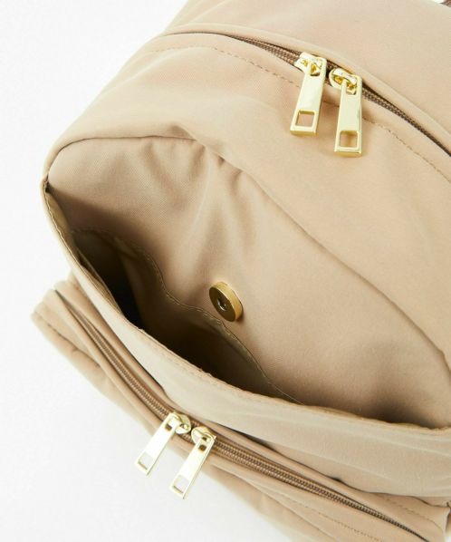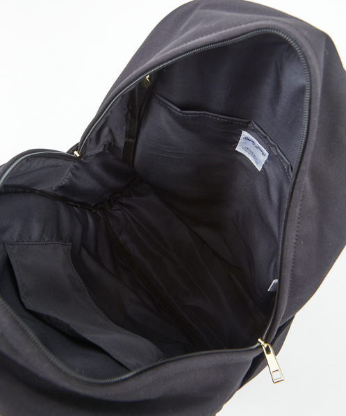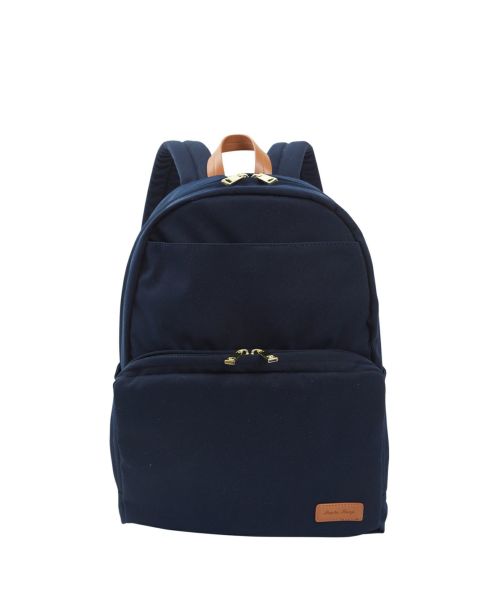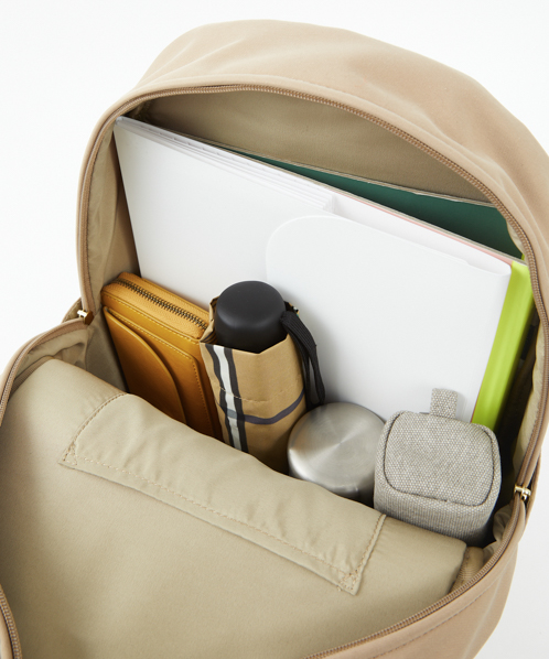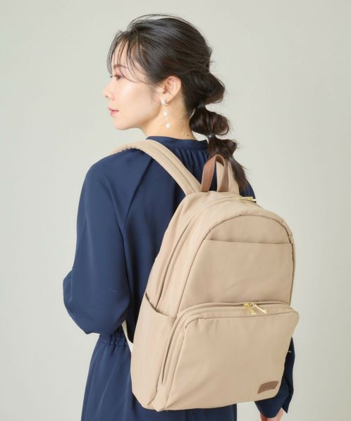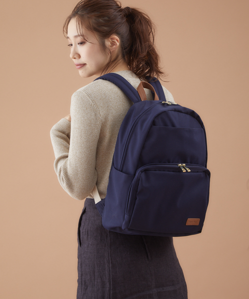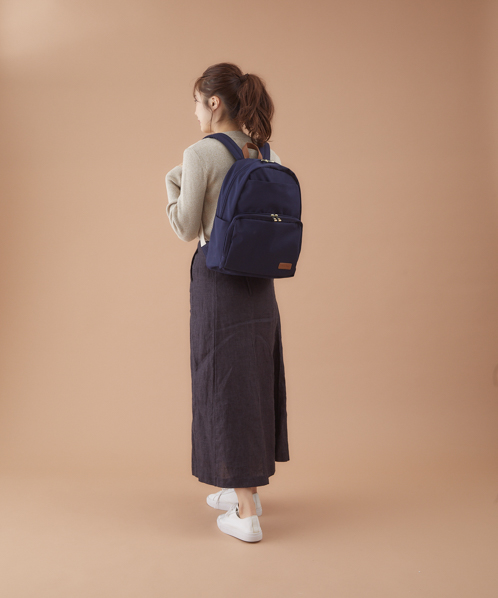 撥水加工を施したコットン調ツイル素材を使用したリュックです。シンプルで飽きのこないデザインに仕上げたので長くお使いいただけます。10の便利なポケットが付いていて、全面のファスナー収納はじゃばら付きで大きく開いて中身が見やすいです。背面にはメイン収納への直結ファスナーとセキュリティポケットが付いています。