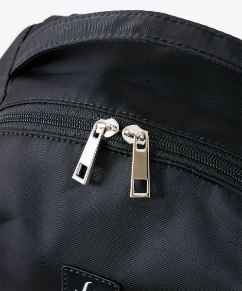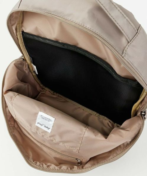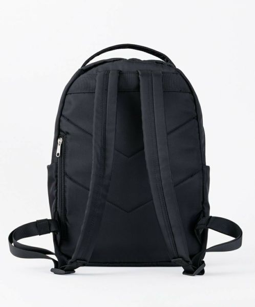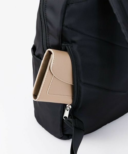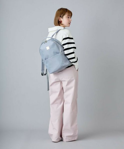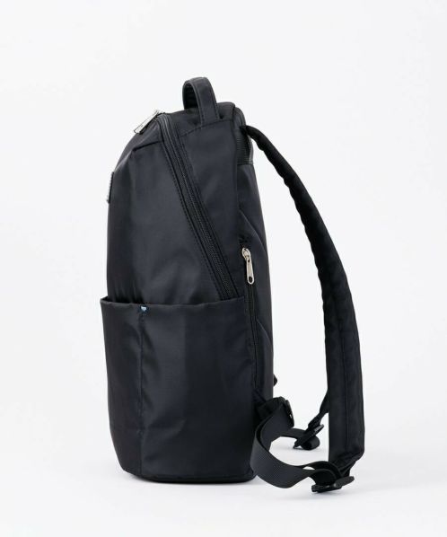 上品なツヤ感のある撥水・抗菌加工を施した生地を使用したアイテム。立体的なアウトポケットや配色ステッチがこだわりのポイント。雨の日に濡れてしまっても気にせず快適に使える機能的なシリーズです。A4ノートや13インチのPCが入るサイズのリュック。ポケットは7箇所あり、背面にはセキュリティポケットがついていてお財布の収納も安心です。荷下ろしする際、手でも持ちやすいよう上部にハンドルがついている便利な仕様。スリムな印象ですが、13Lの容量があり、荷物が多くなりがちな方にもおすすめです。