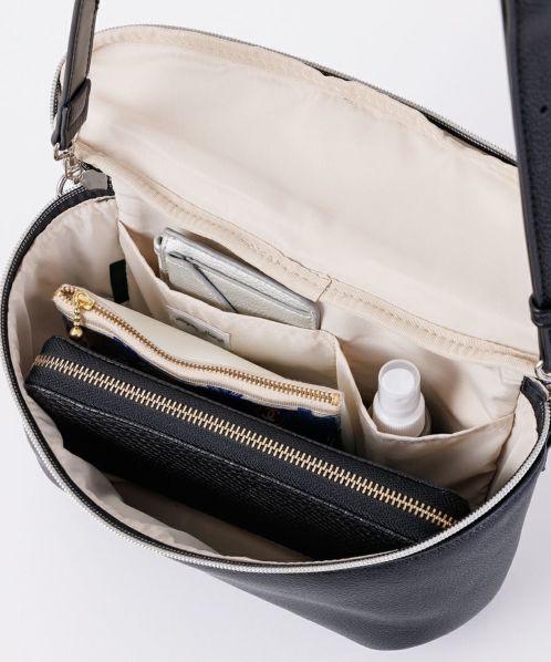 なめらかなフェイクレザーとふっくらとしたフォルムが大人かわいいアイテム。ナチュラルで優しいカラーリングにシルバー金具を合わせた高見え感バッチリのバッグシリーズです。クロスボディバッグは、ガバッと開いて荷物が探しやすい仕様。ペットボトルと長財布が同時に入る見た目以上の容量のサイズ感。スマホが入る背面ポケットが付いているのも使いやすいポイント!