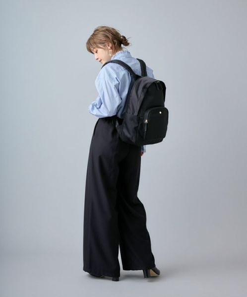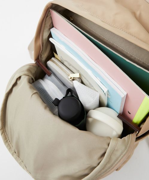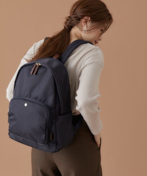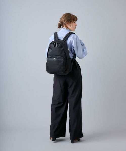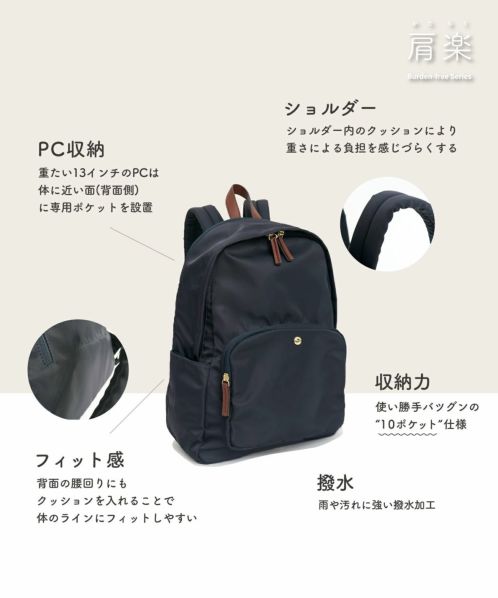 肩の負担を軽くするために、ショルダー内のクッション材にこだわりました。また、体に近い面(背面側)に13インチのPCが収納ができる専用ポケットを設置。背面の腰回りにクッションも入れ、より体のラインにフィットしやすくしました。ポケットも10個あるので、使い勝手も抜群。嬉しい撥水加工で、雨の日でも安心です。A4サイズもしっかり収納できるので、通勤や通学にもオススメの一押しリュックです。
