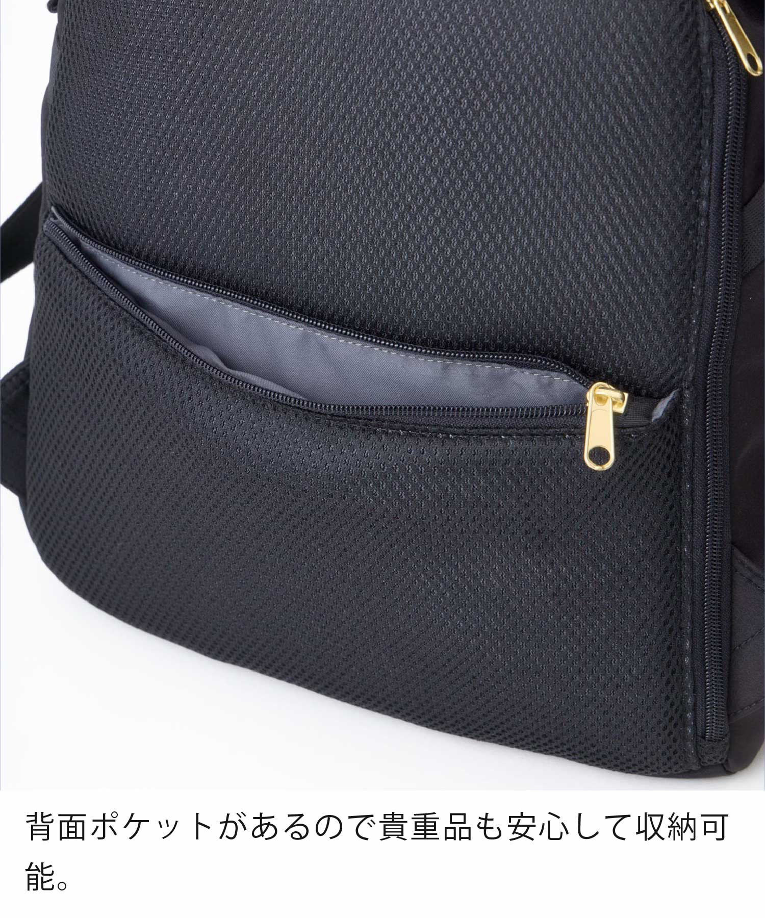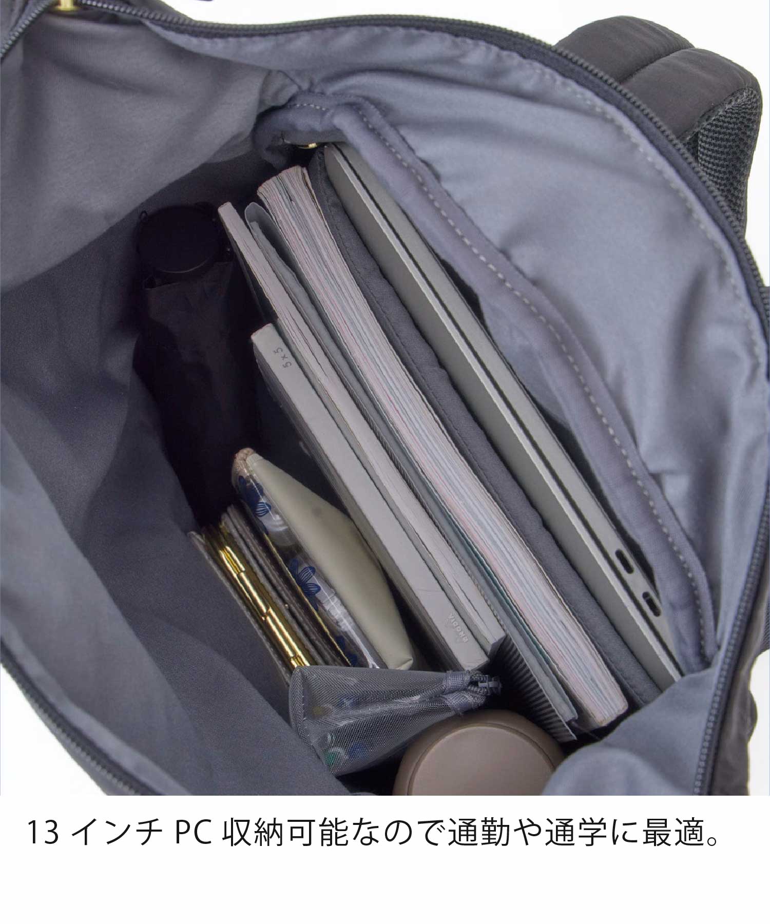 くたっとした形でリラックス感を演出しつつ、キラッとした金具感で上品カジュアルなテイストのリラクシーシリーズ。前持ちしたままでも荷物が取り出しやすい両サイドのファスナーポケットは、長財布もすっぽり収まる安心の収納力です。開口部のサイドは簡単に取り外しが可能な設計になっており、大きく開くことでバッグの中が隅々まで見渡せ、荷物の出し入れがスムーズに行えます。さらに13インチのPCが収納可能。通勤や通学、さらにはアクティブなアウトドアシーンまで、様々なライフスタイルで大活躍するアイテムです。