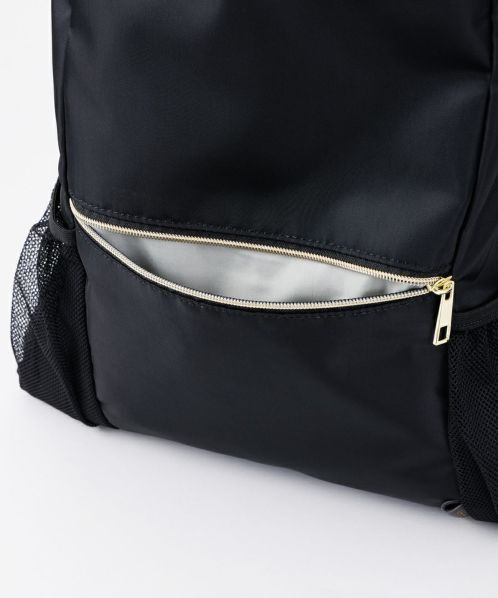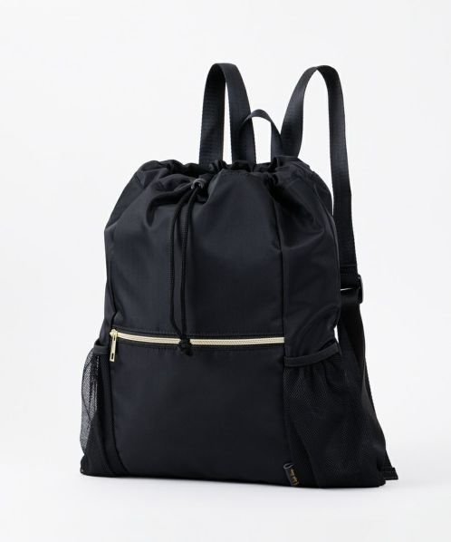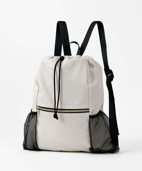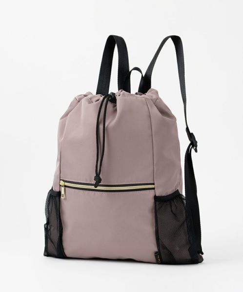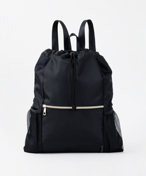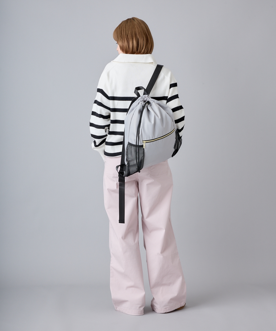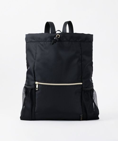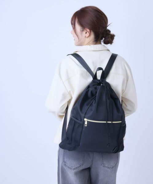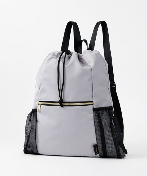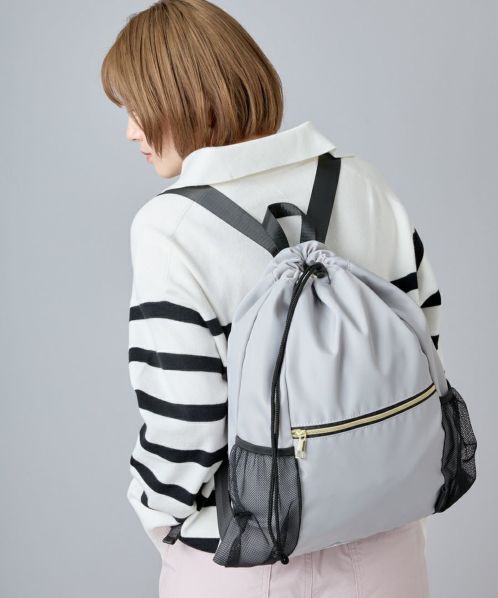 軽やかに持てる撥水ポリエステル生地のベーシックなバッグ。ハリのある生地とゴールドの金具が高見えする上品なシリーズ。撥水機能つきで雨の日やお子様と水場で遊ぶ際なども安心。内生地は明るめの配色なので、バッグの中の荷物が見やすいのが特徴です。トレンドのナップサック型リュック。ショルダーは幅広めに設定しており肩に優しい仕様。ポケットは5箇所あり、両サイドのポケットはペットボトルや折り畳み傘が収納できます。折りたたむこともできるので、旅行などの荷物の多いシーンにも活躍するアイテムです。
