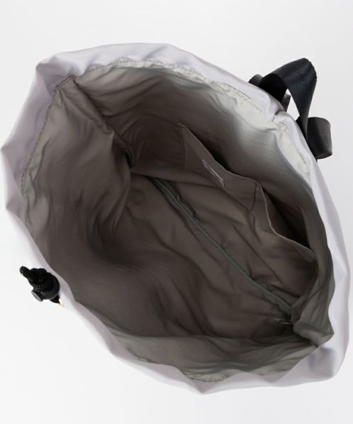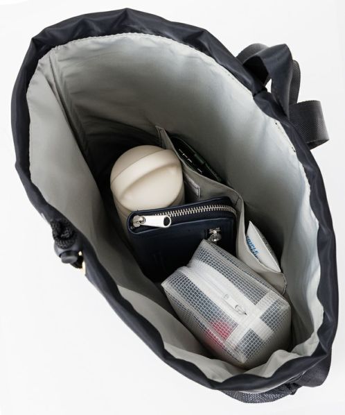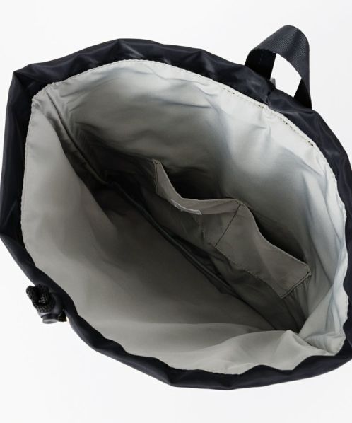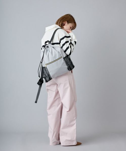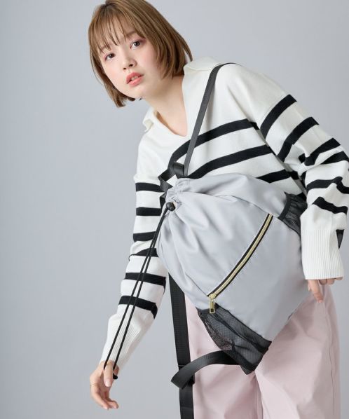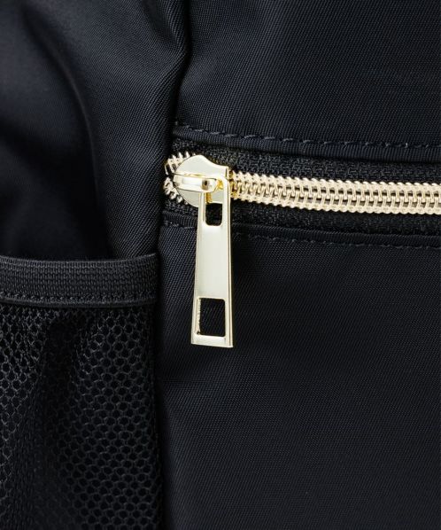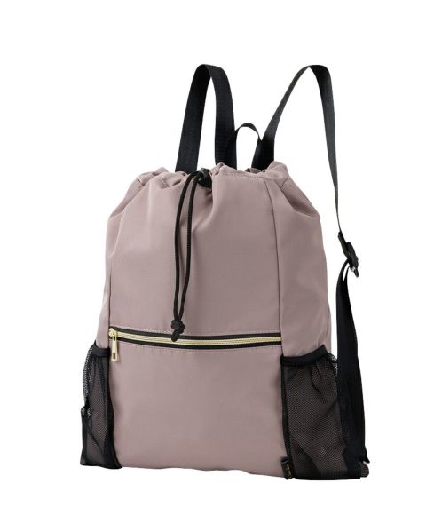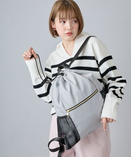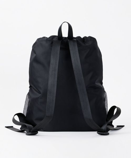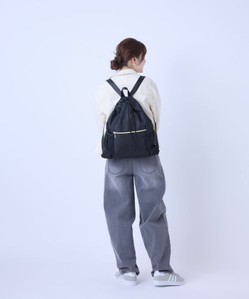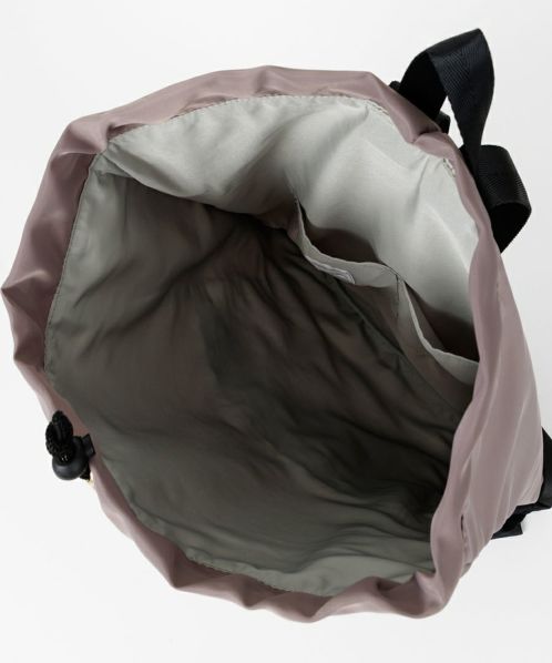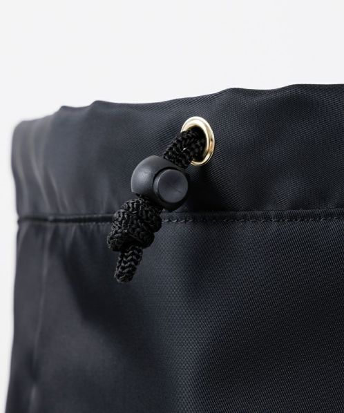 軽やかに持てる撥水ポリエステル生地のベーシックなバッグ。ハリのある生地とゴールドの金具が高見えする上品なシリーズ。撥水機能つきで雨の日やお子様と水場で遊ぶ際なども安心。内生地は明るめの配色なので、バッグの中の荷物が見やすいのが特徴です。トレンドのナップサック型リュック。ショルダーは幅広めに設定しており肩に優しい仕様。ポケットは5箇所あり、両サイドのポケットはペットボトルや折り畳み傘が収納できます。折りたたむこともできるので、旅行などの荷物の多いシーンにも活躍するアイテムです。