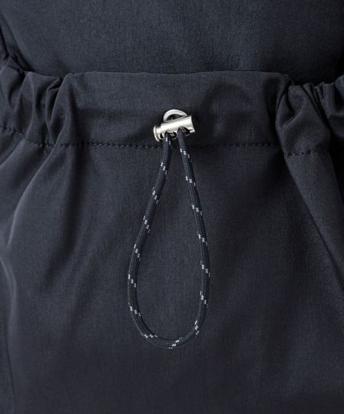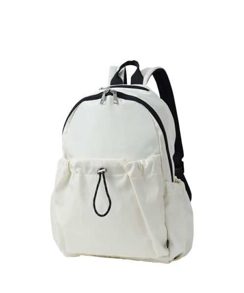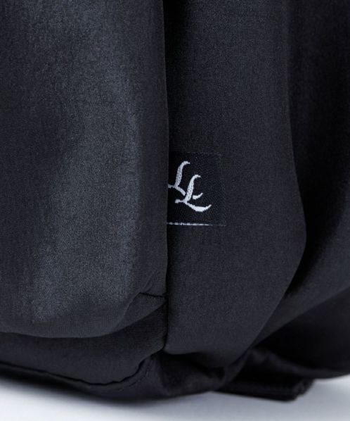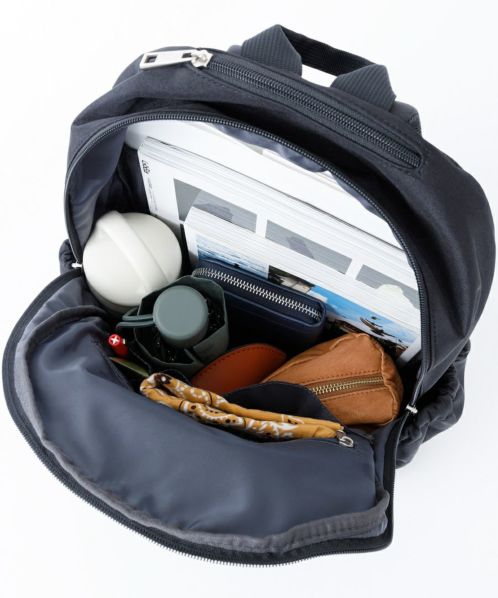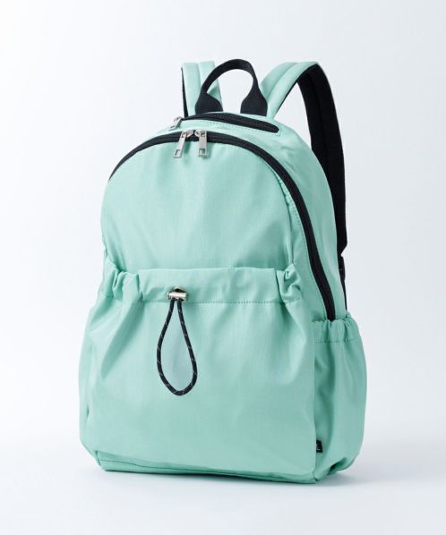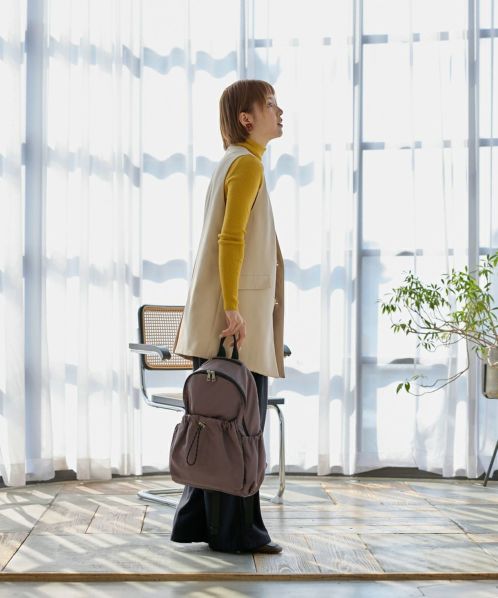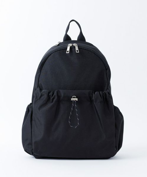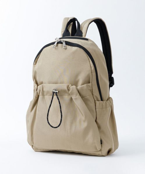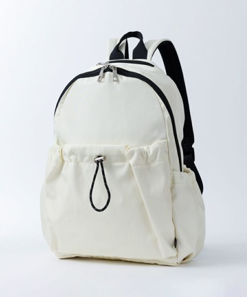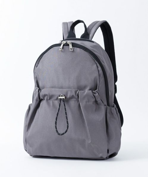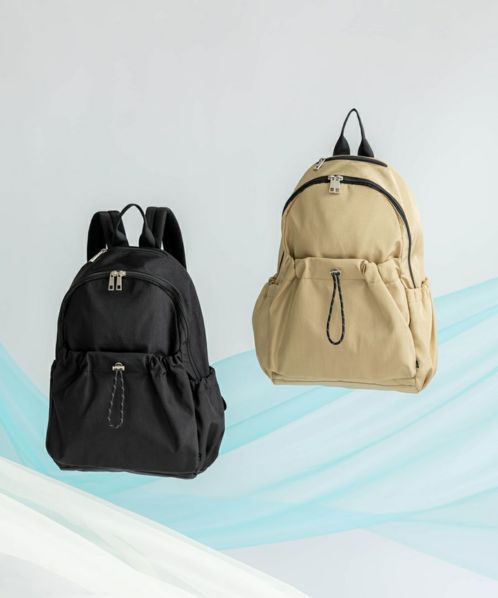くしゅくしゅとしたフォルムが可愛い、トレンドのドロストポケットがポイントのカジュアルなシリーズ。生地はシャリっとした張り感と光沢のある撥水素材を使用しております。柔らかく軽量で、機能性もバッチリ◎正面ポケットのドロストの絞り方によってシルエットのアレンジが可能。A4サイズが収納可能で通勤・通学などに便利です。