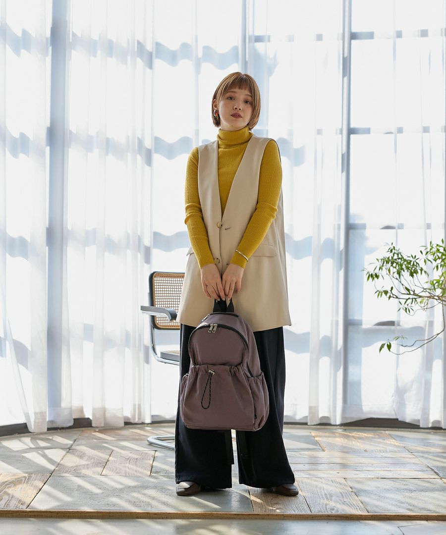 ★ FUDGE 2024年10月号掲載商品 ★ くしゅくしゅとしたフォルムが可愛い、トレンドのドロストポケットがポイントのカジュアルなシリーズ。生地はシャリっとした張り感と光沢のある撥水素材を使用しております。柔らかく軽量で、機能性もバッチリ◎正面ポケットのドロストの絞り方によってシルエットのアレンジが可能。A4サイズが収納可能で通勤・通学などに便利です。
