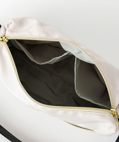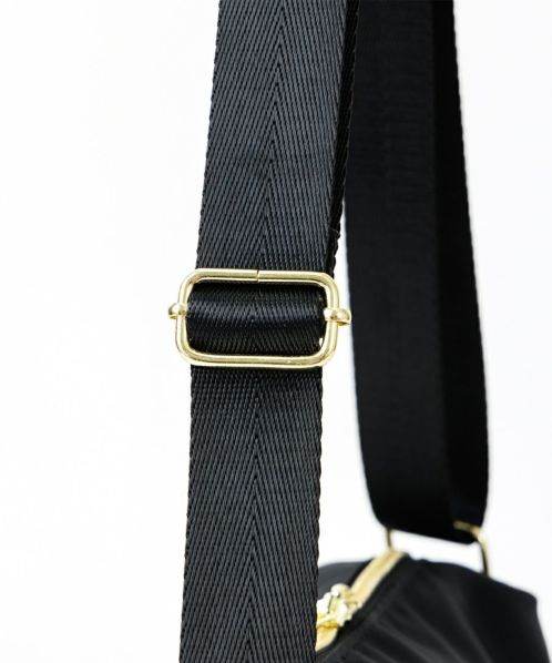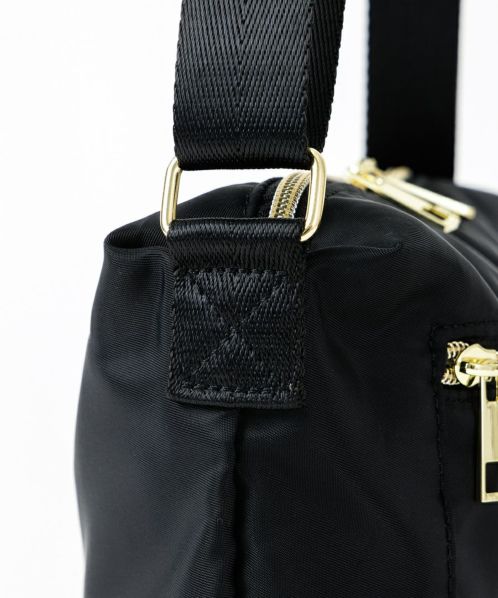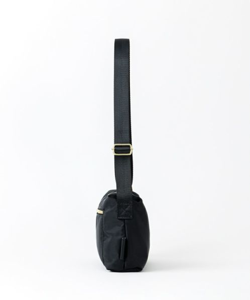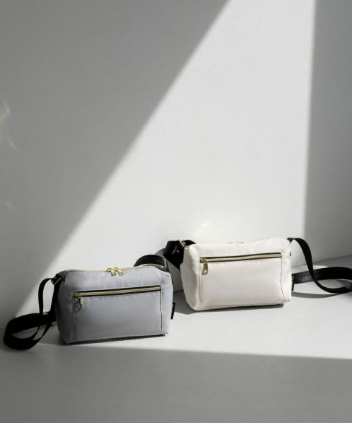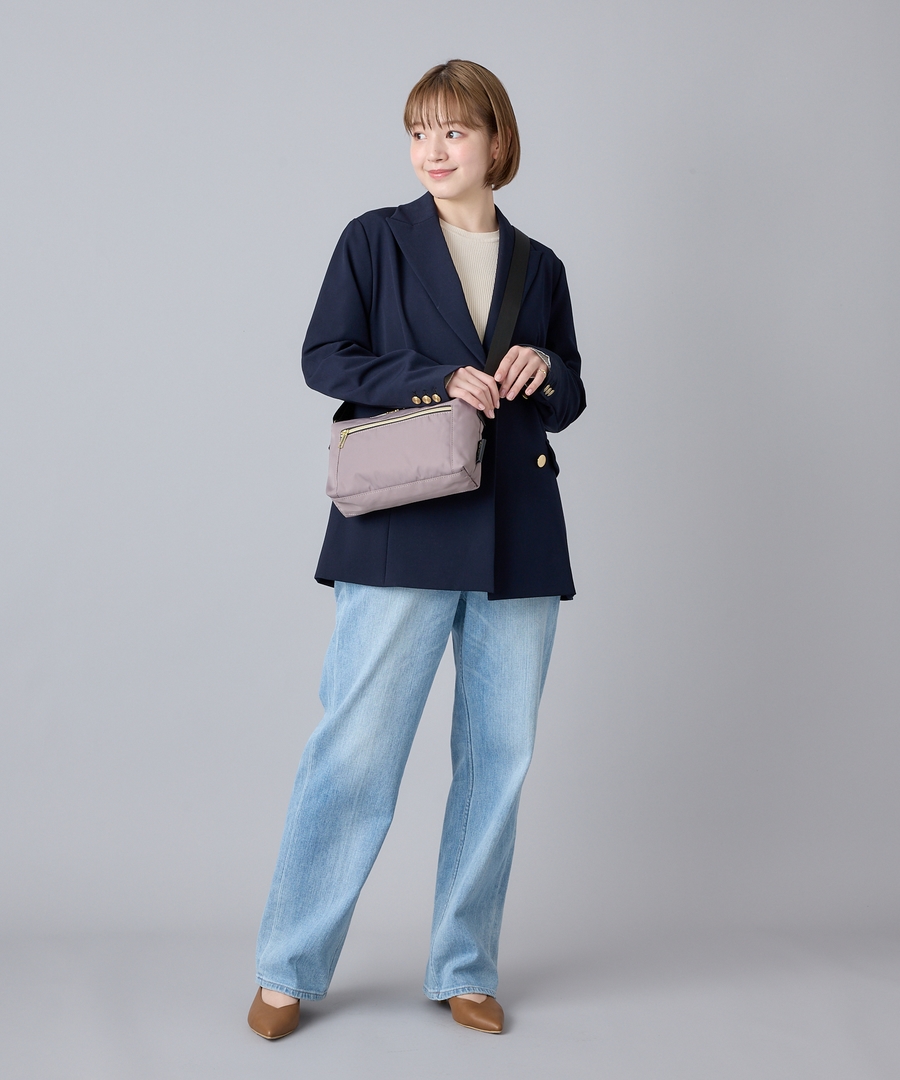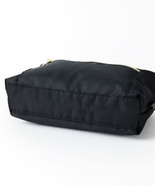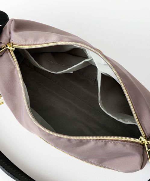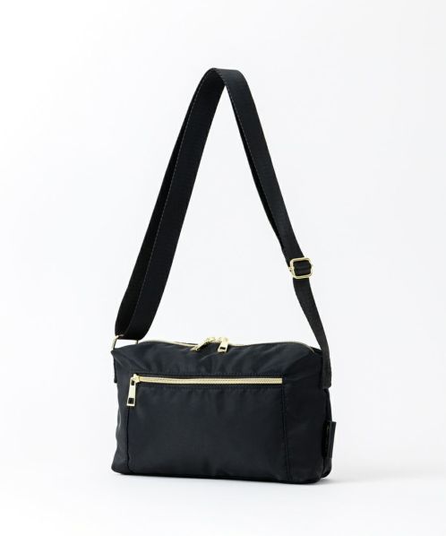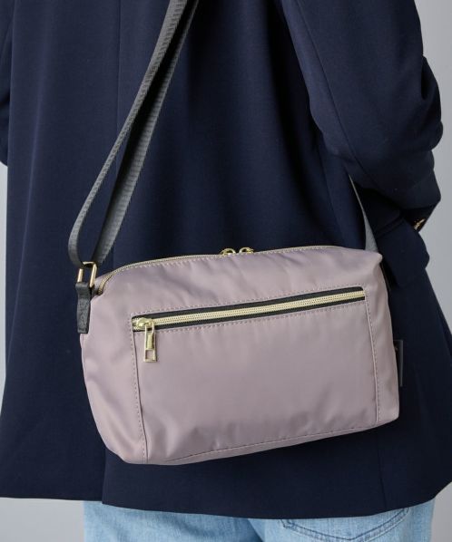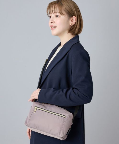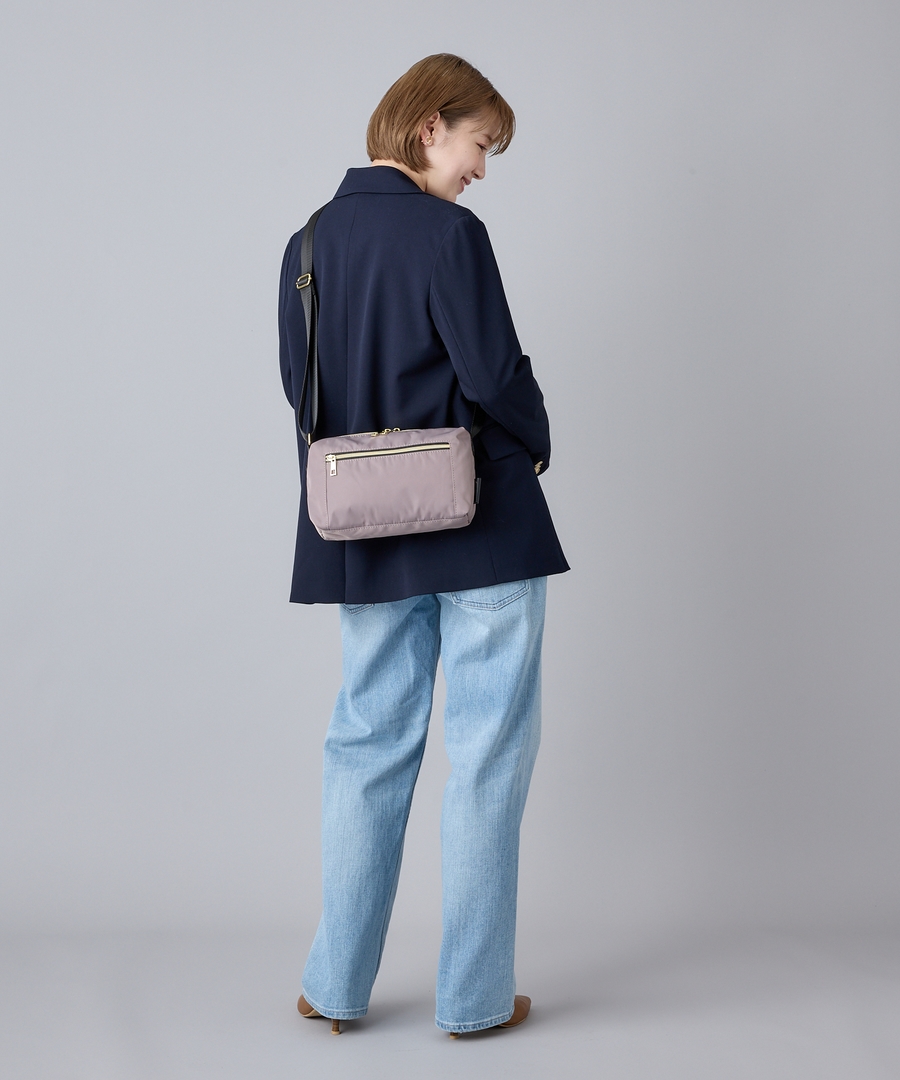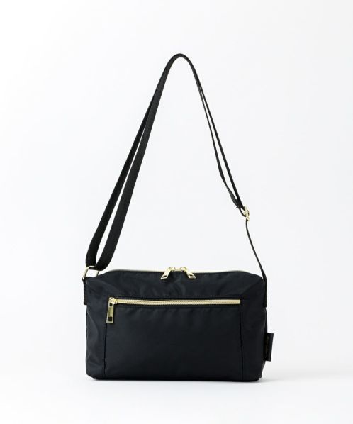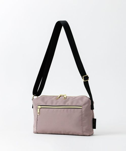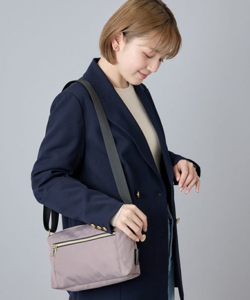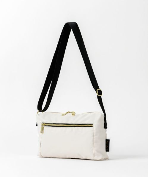 軽やかに持てる撥水ポリエステル生地のベーシックなバッグ。ハリのある生地とゴールドの金具が高見えする上品なシリーズ。撥水機能つきで雨の日やお子様と水場で遊ぶ際なども安心。内生地は明るめの配色なので、バッグの中の荷物が見やすいのが特徴です。500mlペットボトルと長財布が同時収納可能なミニショルダーバッグ。ショルダーは幅広めに設定しており肩に優しい仕様。外側のポケットはスマホが入るサイズ感で、ちょっとした外出に便利なアイテムです。