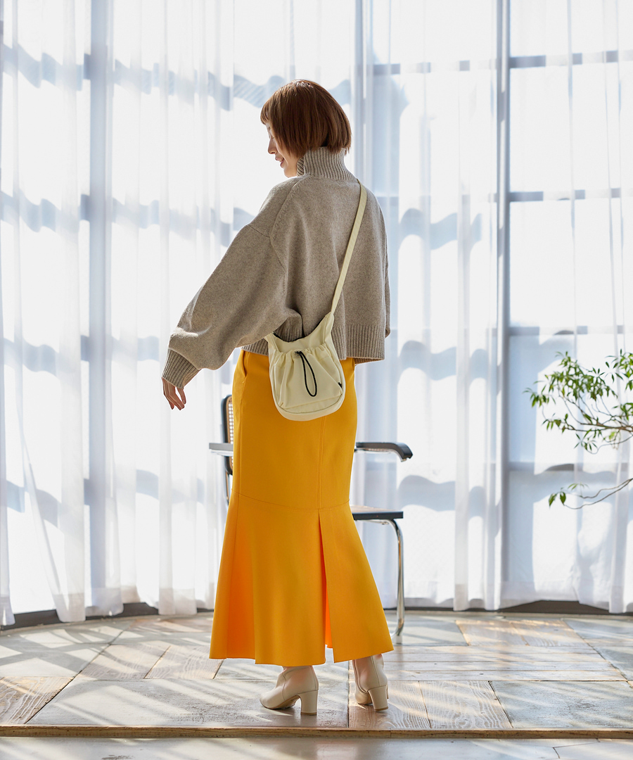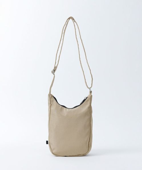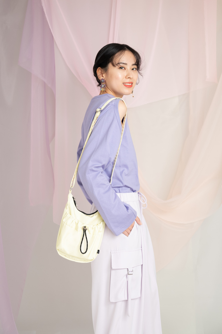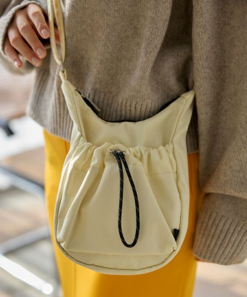 くしゅくしゅとしたフォルムが可愛い、トレンドのドロストポケットがポイントのカジュアルなシリーズ。生地はシャリっとした張り感と光沢のある撥水素材を使用してます。柔らかく軽量で、機能性もバッチリ◎長財布が縦に収まるサイズ感で、開口部はファスナー開閉式になっており安心。ちょっとした外出時に便利なアイテムです。