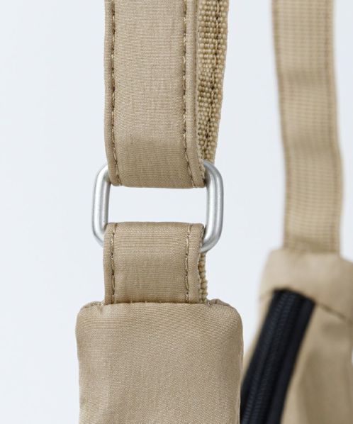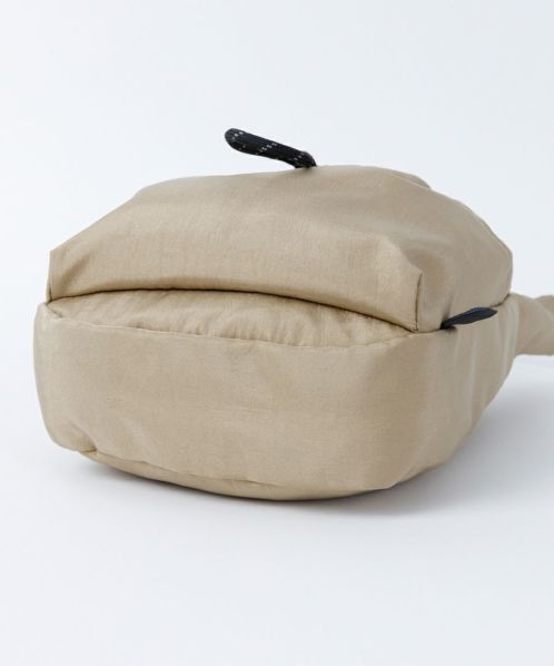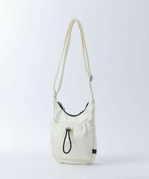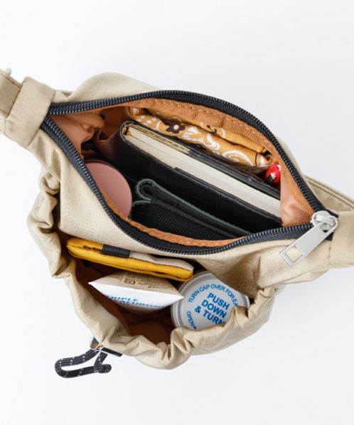 くしゅくしゅとしたフォルムが可愛い、トレンドのドロストポケットがポイントのカジュアルなシリーズ。生地はシャリっとした張り感と光沢のある撥水素材を使用してます。柔らかく軽量で、機能性もバッチリ◎長財布が縦に収まるサイズ感で、開口部はファスナー開閉式になっており安心。ちょっとした外出時に便利なアイテムです。