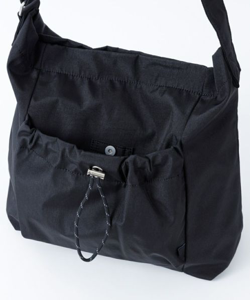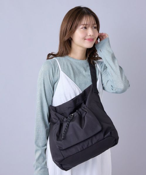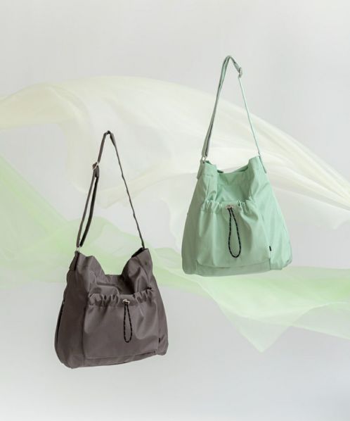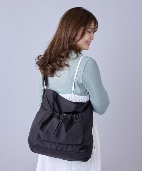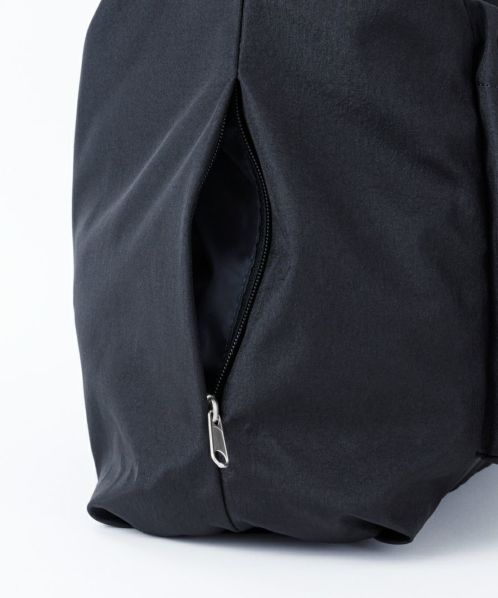 くしゅくしゅとしたフォルムが可愛い、トレンドのドロストポケットがポイントのカジュアルなシリーズ。生地はシャリっとした張り感と光沢のある撥水素材を使用しております。柔らかく軽量で、機能性もバッチリ◎ガバッと大きく開く開口部とサイドのファスナーポケットが特徴。A4サイズが収納可能で通勤・通学などに便利です。