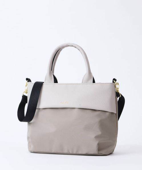 大人カジュアルなテイストで人気のグロッシーコンビシリーズに新型の2WAYトートバッグが登場!柔らかいシボ合皮とポリエステルを組み合わせ、カジュアルすぎない女性らしいバッグに仕上げました。600mlペットボトルや長財布はもちろん、荷物が多めの女性でもちょうどいいこだわりのサイズ感です。ショルダー付きで2WAYでご使用いただけます。