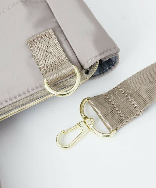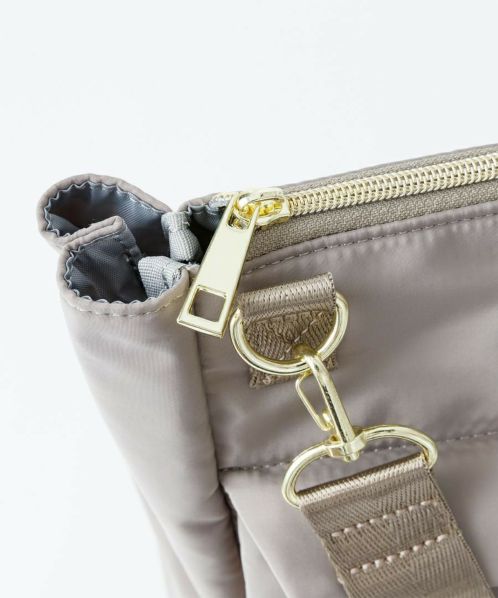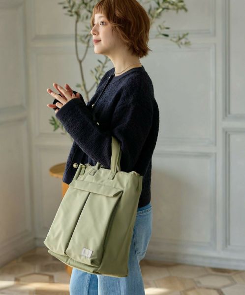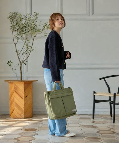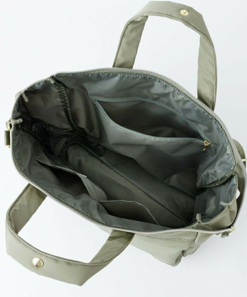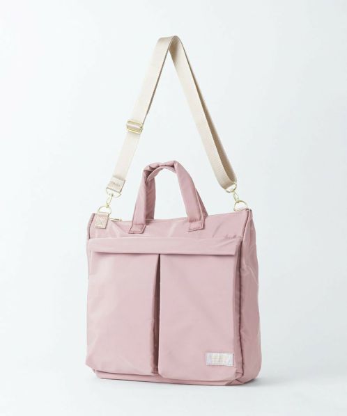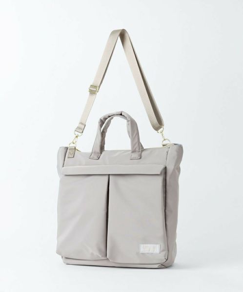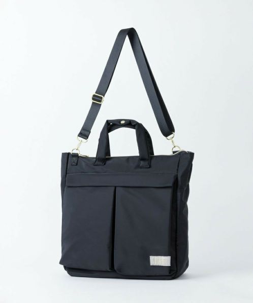 トレンドのヘルメットバッグを、上品なツヤ感のあるはっ水ポリエステルとゴールド金具を合わせ、キレイめな雰囲気に仕上げたシリーズ。機能性はそのままに、アーミーなアイテムを大人っぽくカジュアルに楽しめるデザイン!スプリングホック付きのもっちりハンドルで使い易さも◎ 開口部はファスナー付きで安心の仕様。ワンハンドルとショルダーの2WAYで使えるので、さまざまなシーンに対応します。メインポケットはA4サイズの資料などが余裕で入り、内ポケットも充実しています。前面のツインポケットは長財布や折り畳み傘、500mlペットボトルも収納できる便利なサイズ感です。