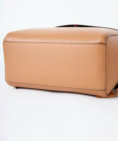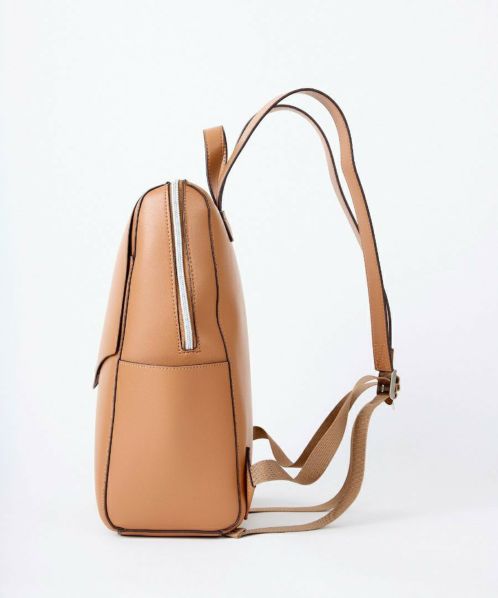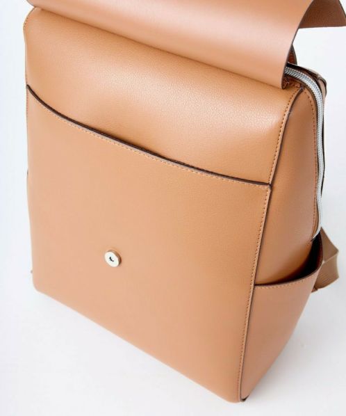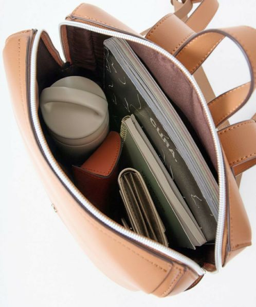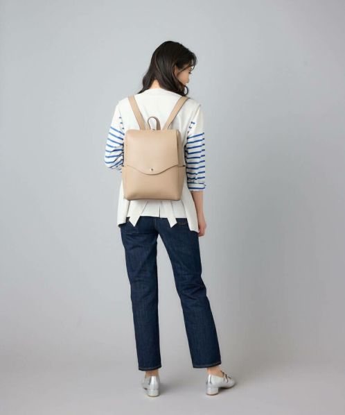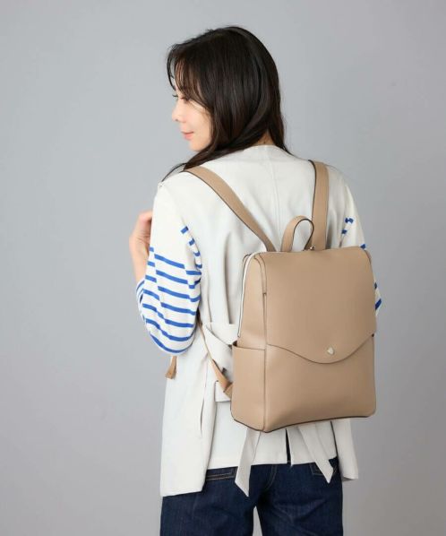 「え、かるい!」と、思わず声をあげてしまう軽量感。高級感と落ち着きがあるのでカジュアルコーデにこのバッグを合わせるだけで一気にきちんと感が出ます。重くて敬遠していた合皮のリュックも、これなら可愛いくラクラク!ほどよいハリとやわらかさがあり、本革のようなしっとりとした手触りです。