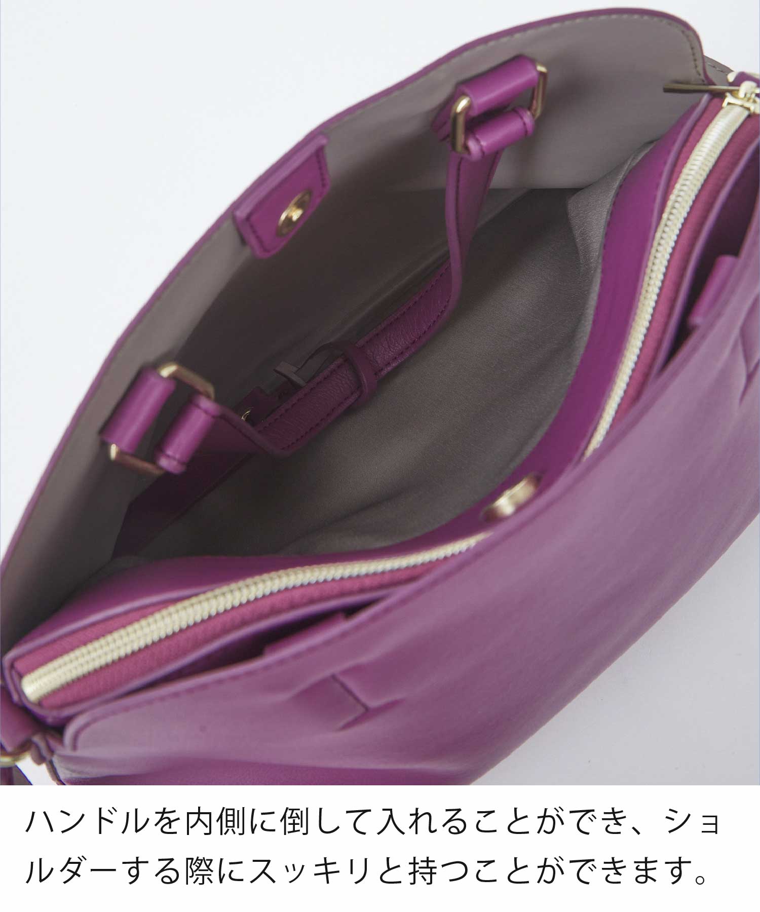 大人気シリーズに新シリーズ登場!!≪かるいかばん-soft-≫ 「 オンオフで使える軽いカバン 」をコンセプトに開発した 合成皮革を使用し、シンプルに仕上げたデザインが魅力。 ハンドルは内側に倒して収納でき、 ショルダーで使用する時はすっきりとした見た目に◎ ショルダー紐は、お客様の声を反映し幅を少し太く改良し、 余りのショルダー紐が折れないようループを追加しました。 新たに飾りネームを追加し、 底のデザインでこだわりをプラス! ほどよいハリとやわらかさがあり、 本革のようなしっとりとした手触りです。
