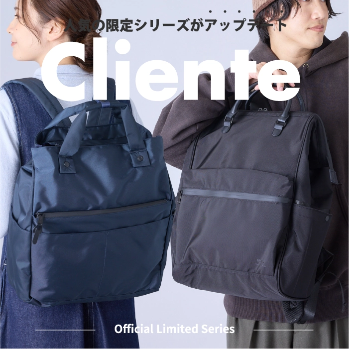 “ こうだったらいいな。“お客様の声をぎゅっと凝縮した機能性たっぷりな『Cliente(クリエンテ)』シリーズ。性別・年齢問わずに幅広い層のお客様にお使いいただけるよう、ベーシックなデザインに仕上げました。3wayリュックはポケットが多く収納力抜群、メイン収納の開口部はサイドのボタンを外すことで大きく開き、荷物が増えた時も安心です。リュックのショルダーは使わない時は専用の収納ポケットがあるので、シンプルながら細部にもこだわり、普段使いからお仕事バッグとしても幅広シーンで活躍します。