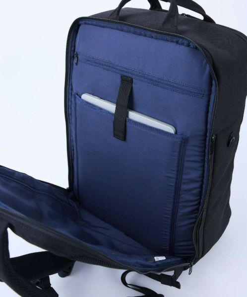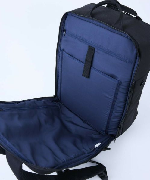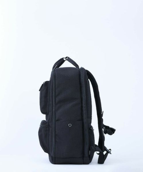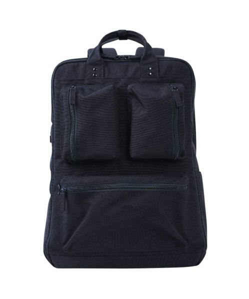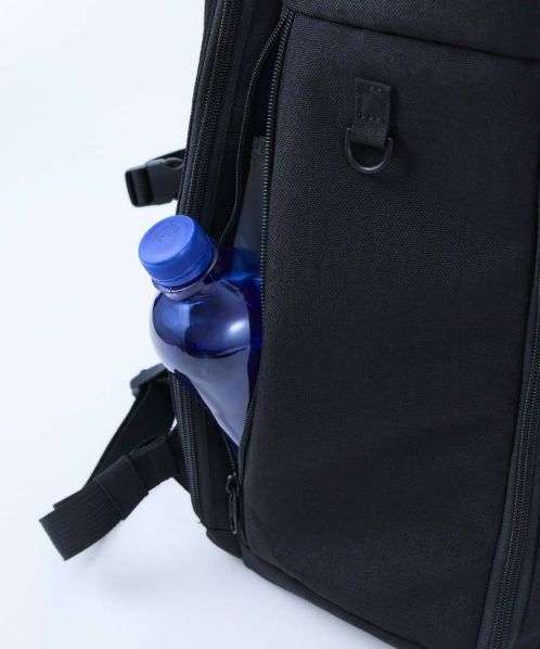 縦開きタイプ。左右対称の前面ポケットがアイコニックなデザインの大容量マルチリュック。2泊分の荷物も仕分けして収納可能。内生地撥水のドリンクポケットですっきり収納。荷物が少なくても自立する設計。