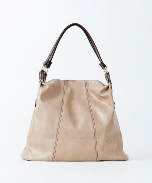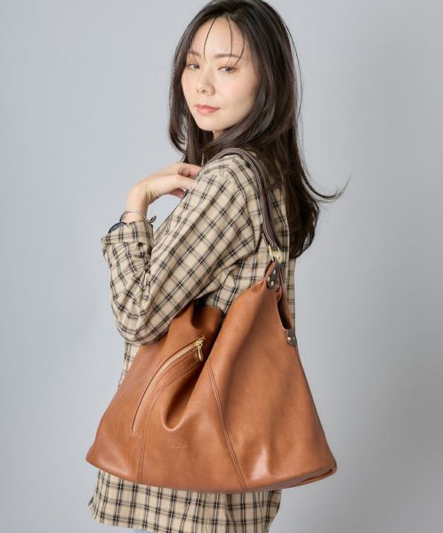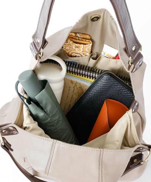 表情のある風合いの良い合皮がポイントのバッグ。過去ヒットしたざっくりと使える2ハンドルトートがリバイバル! A4サイズの資料が楽々と入り、ポケットは3つと収納力抜群。きらりと光る金属パーツと、ハンドルとボディに配されたステッチが上品な印象を与える逸品です。