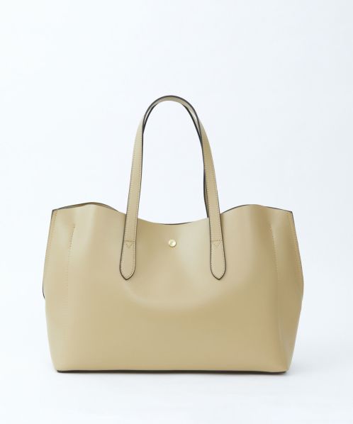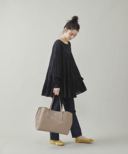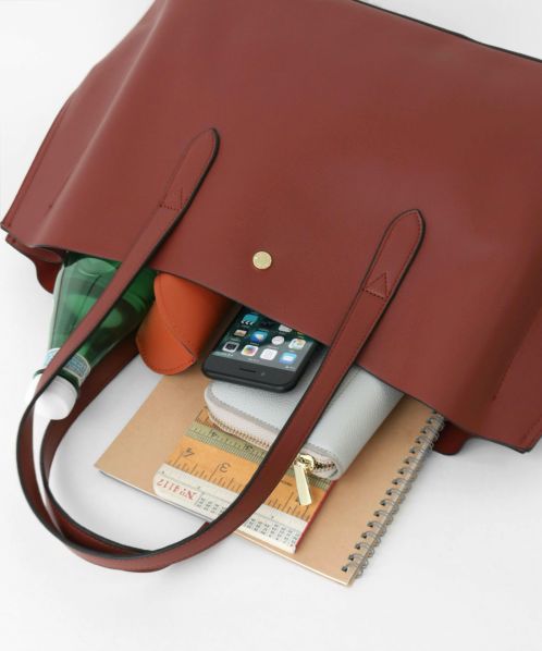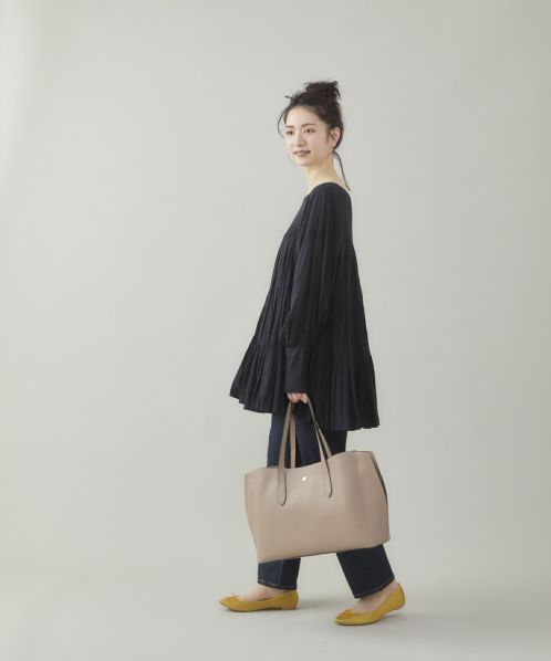 「 オンオフで使える軽いカバン 」をコンセプトに開発した合成皮革を使用したシンプルなデザインのアイテム。本体だけで重たさを感じるアイテムが多いトート。500mlペットボトル飲料よりも軽い約480gを実現したトートバッグは、ぜひ出勤用のバッグとしてご使用いただきたいアイテム。あおり型の開口部も書類などの分別にご使用いただけます。ほどよいハリとやわらかさがあり、本革のようなしっとりとした手触りです。