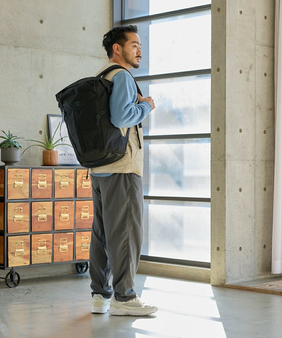 シックで上品、だけど機能的。撥水加工のボディ生地&止水ファスナーで雨の日も安心。底面生地は汚れをさっと拭き取れる合皮を使用。荷物の量に合わせて開口部で容量を調節できるロールトップリュック。PCは約15インチまでのサイズが収納可能です。前面両脇に配した止水ファスナーは独立しており、デザインアクセントだけじゃない実用性を兼ね備えています。