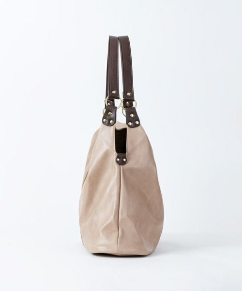 表情のある風合いの良い合皮がポイントのバッグ。過去ヒットしたざっくりと使える2ハンドルトートがリバイバル! A4サイズの資料が楽々と入り、ポケットは3つと収納力抜群。きらりと光る金属パーツと、ハンドルとボディに配されたステッチが上品な印象を与える逸品です。
