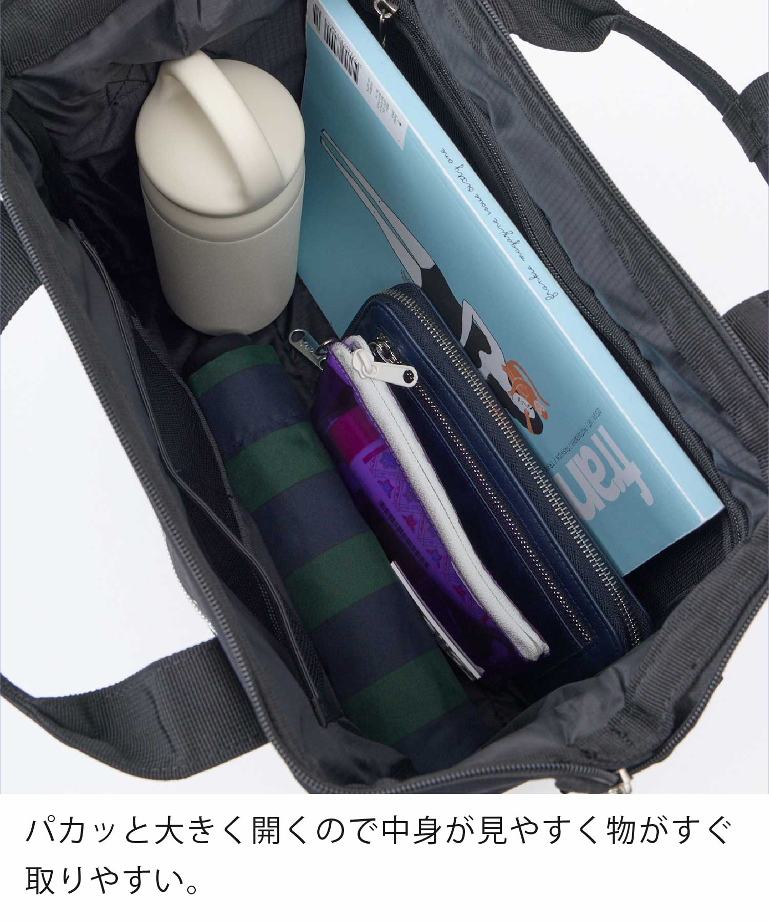 パカッと大きく開く口金構造を採用。中身が隅々まで見渡せるので、必要なものを探す手間がありません。A4サイズの書類やファイルも引っかかることなくスムーズに出し入れでき、忙しい朝や移動中もスマートに振る舞えます。