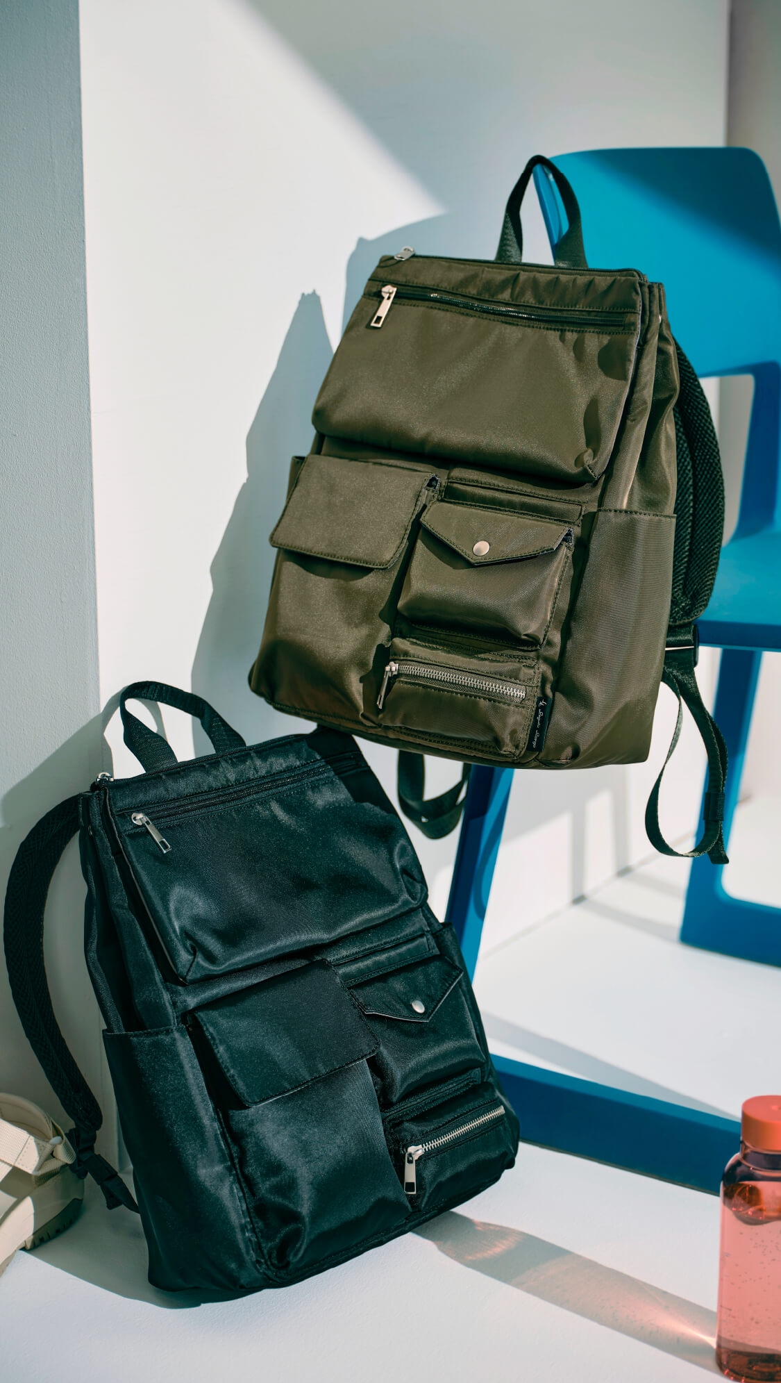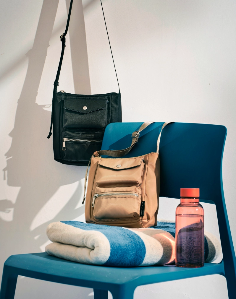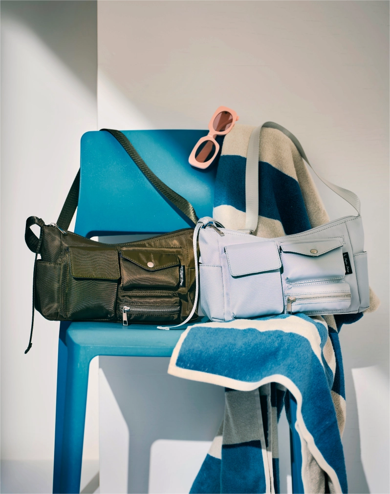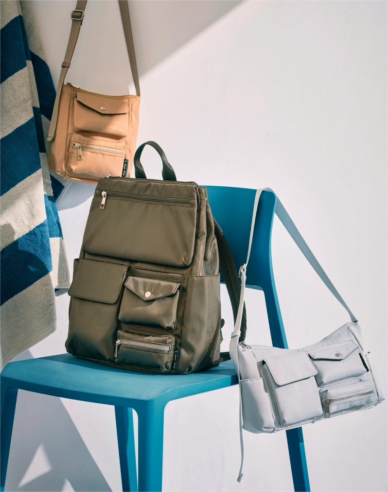 さまざまなサイズのマルチポケットは、デザインのポイントでありながら実用的。