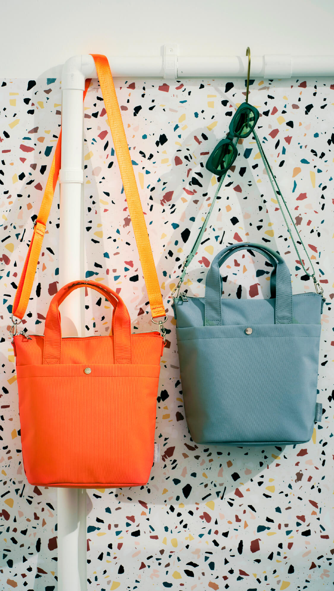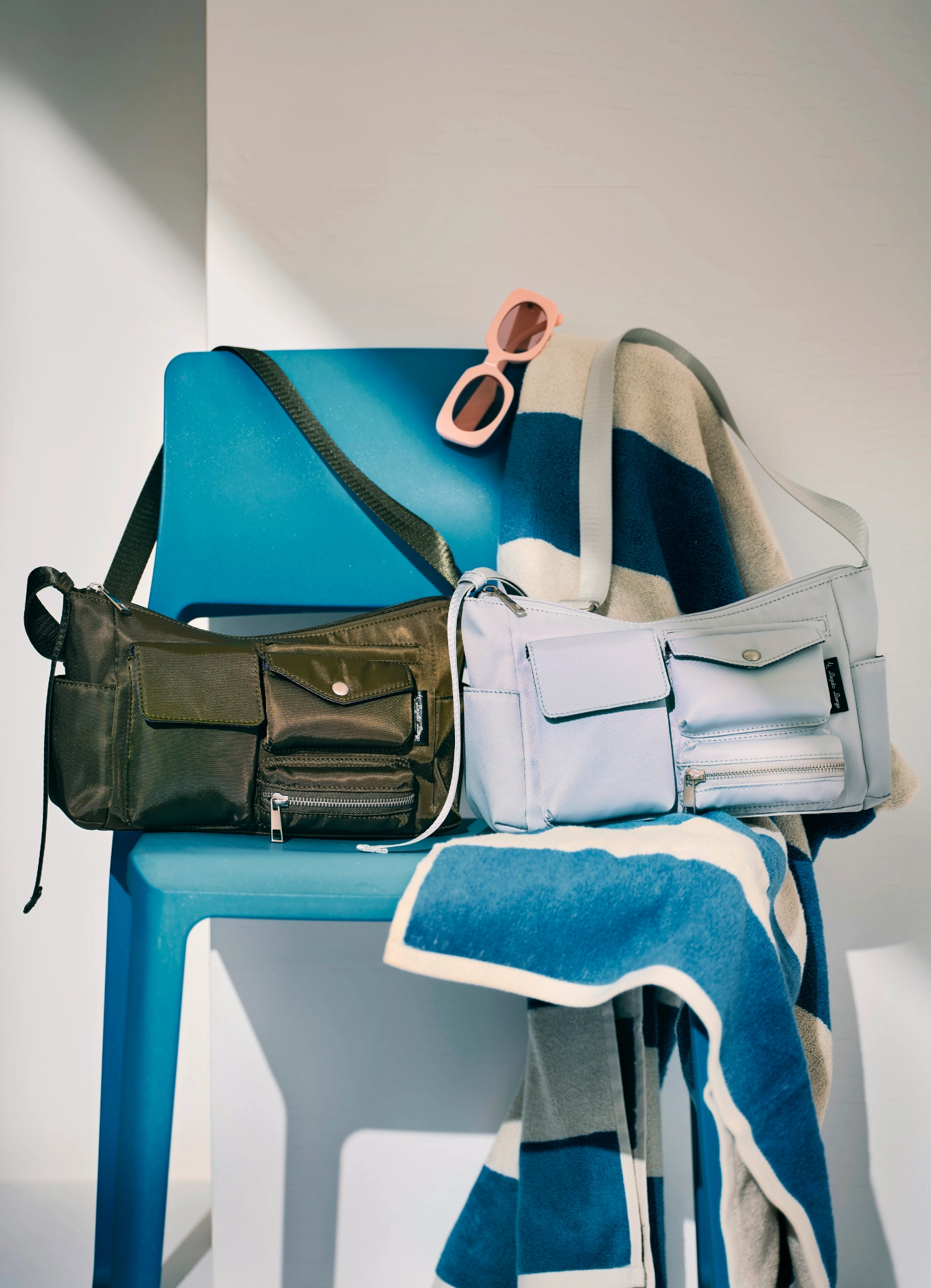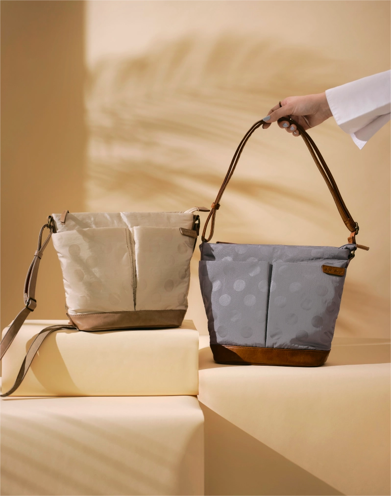 さまざまなサイズのマルチポケットは、デザインのポイントでありながら実用的。