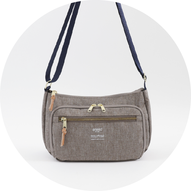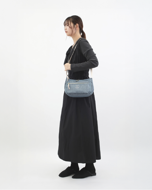 小ぶりな多機能ショルダーバッグ。前面ポケット内に、小物を仕分けて収納できるポケットがたくさんついており、お財布代わりにも使用できるアイテム。600mlのペットボトルもすっぽりと入る使い勝手の良いサイズ感。ややカーブした丸みのあるフォルムが特徴。