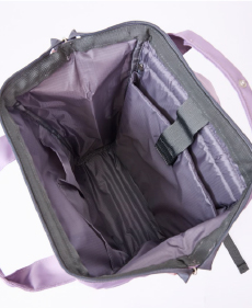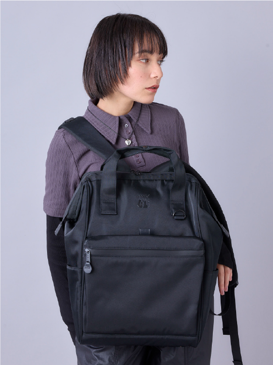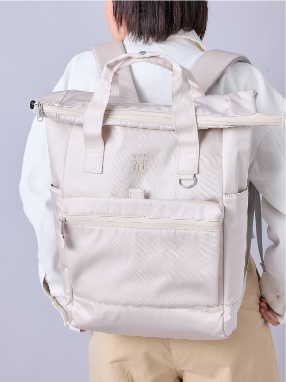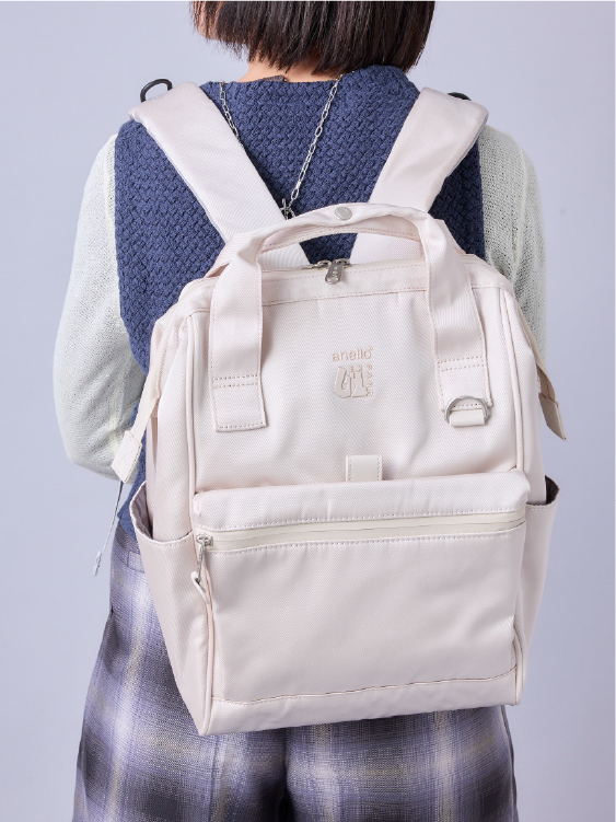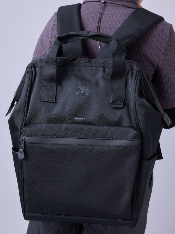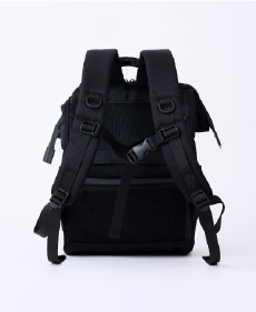 開口部がガバっと開く、anello®の定番口金バックパック。通常のレギュラーサイズよりも少し大きめのサイズ設定。(RS)と同様に、前面には大きめのファスナーポケット+ベルクロ開閉のポケットがあって便利。キャリーオンテープ、着用感のよいショルダーベルト裏と本体背面素材、本体背面セキュリティポケットなど、充実の機能。15インチ対応のPC収納収納付きで、ビジネスシーンにも対応◎