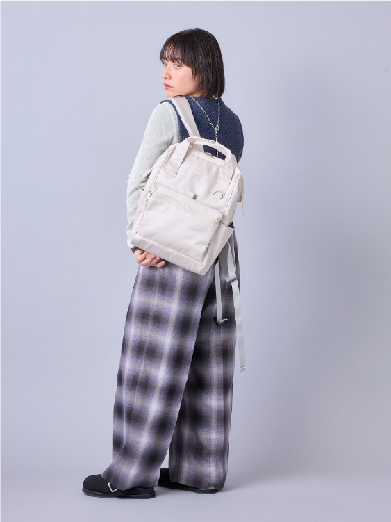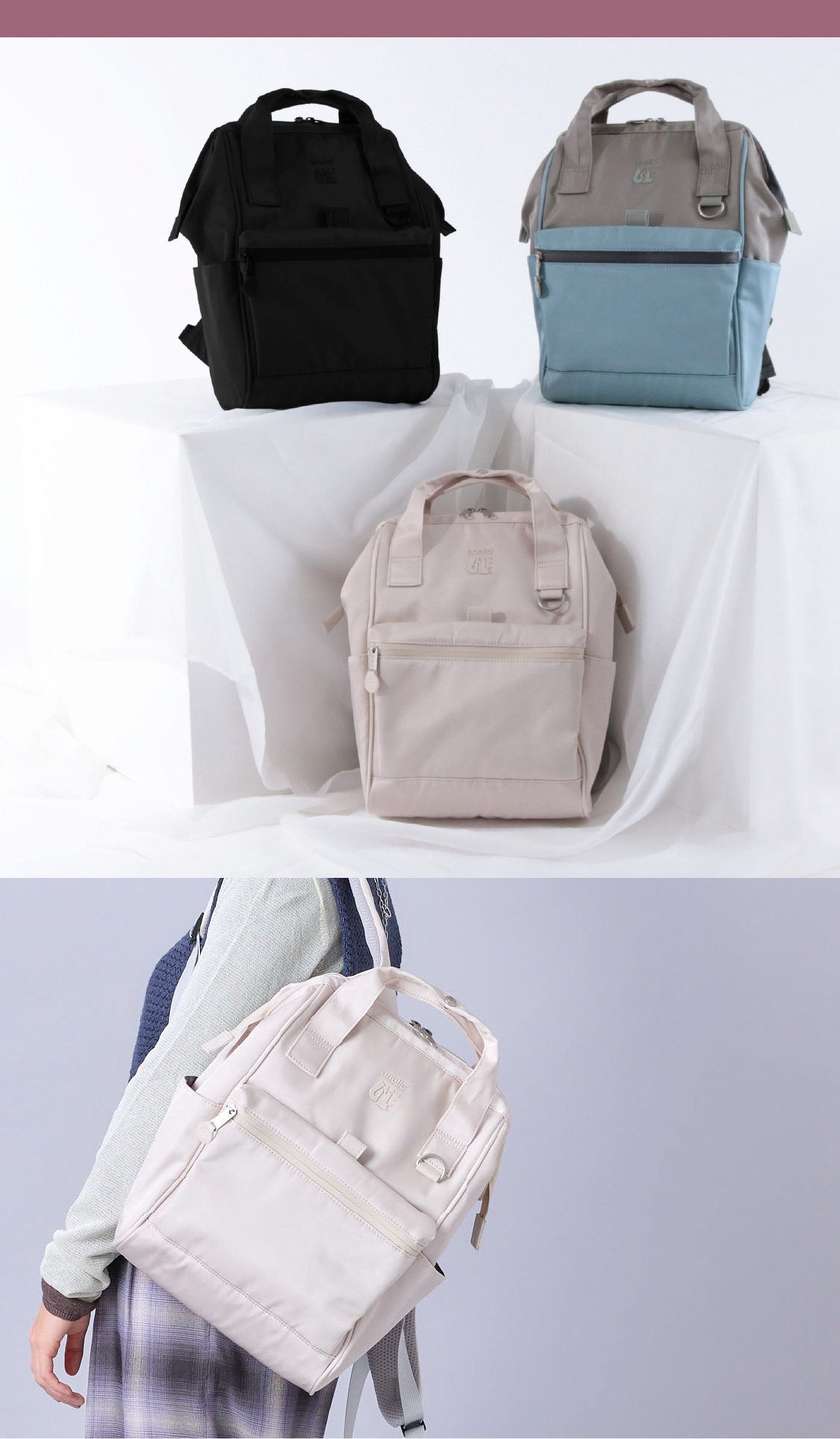 開口部がガバっと開く、anello®の定番口金バックパック。通常のレギュラーサイズよりも少し小さめのサイズ設定。前面には大きめのファスナーポケット+ベルクロ開閉のポケットがあって便利。キャリーオンテープ、着用感のよいショルダーベルト裏と本体背面素材、本体背面セキュリティポケットなど、充実の機能。13インチ対応のPC収納付きでビジネスや通学にも便利なアイテム。