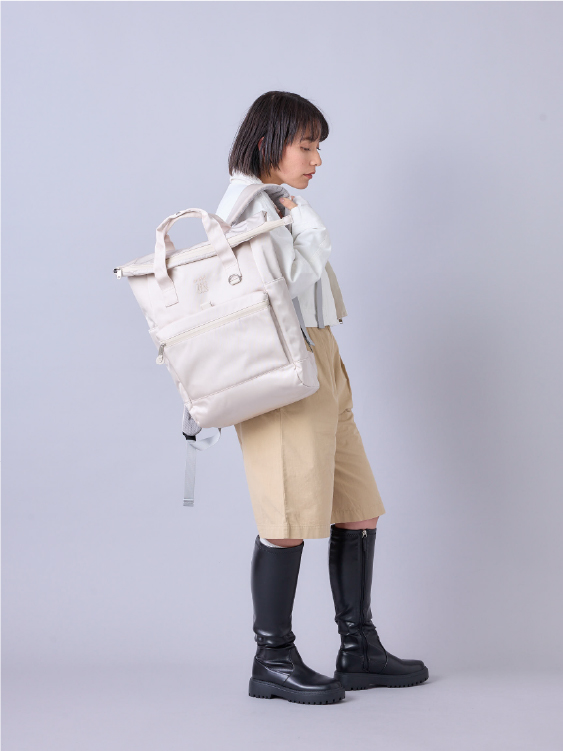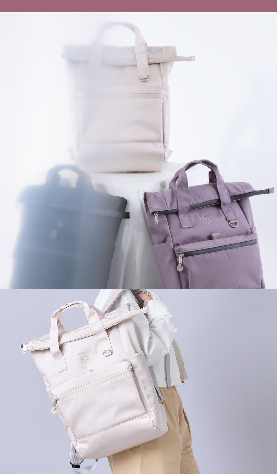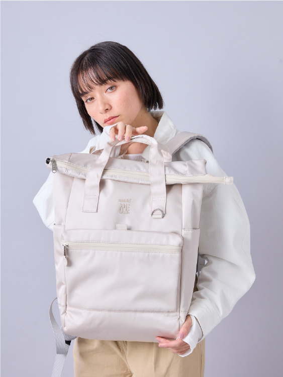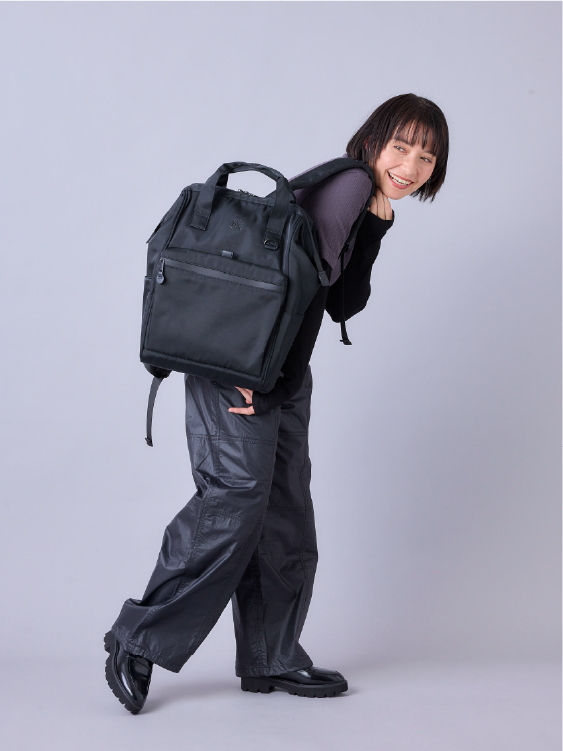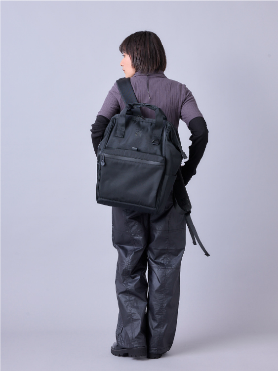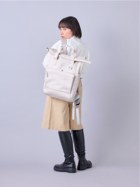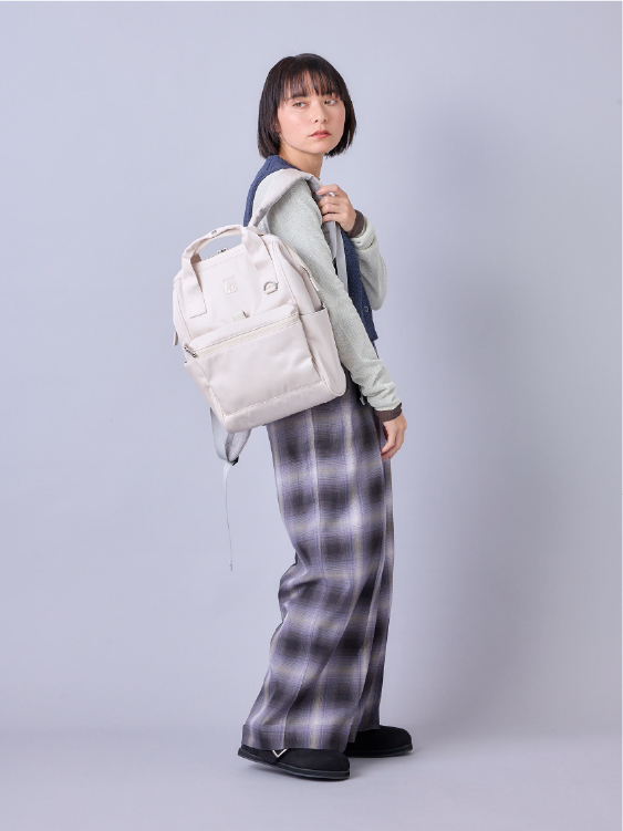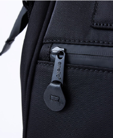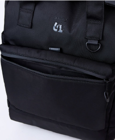 マチがスッキリとした口折れタイプのバックパック。前面には大きめのファスナーポケット+ベルクロ開閉のポケットを採用。キャリーオンテープ、15 インチ対応のP C 収納、着用感の良いショルダーベルトを搭載した使い勝手の良いアイテム。本体背面にはセキュリティポケットがついており機能も充実。23Lの容量で一泊二日の旅行にもぴったりなバッグです。