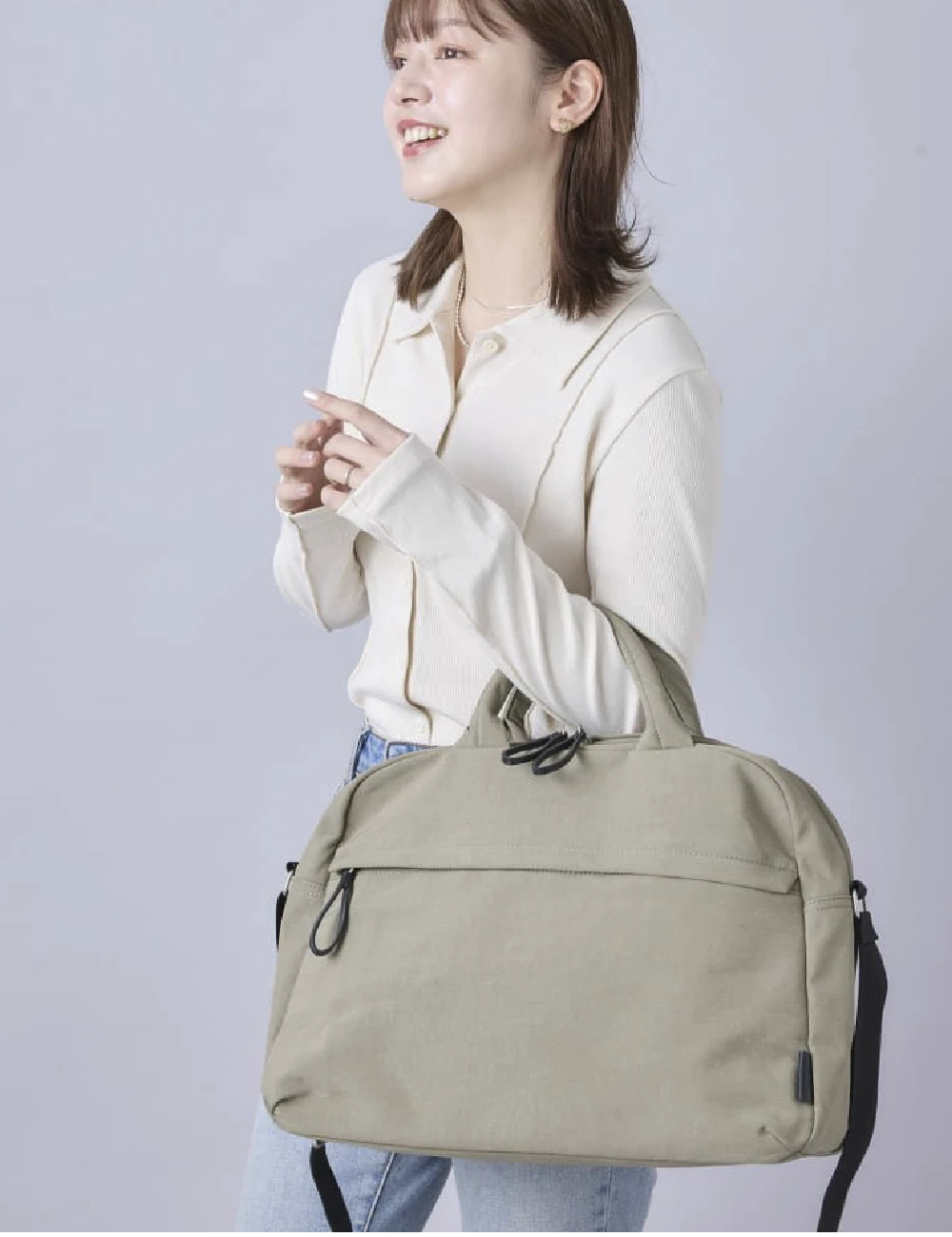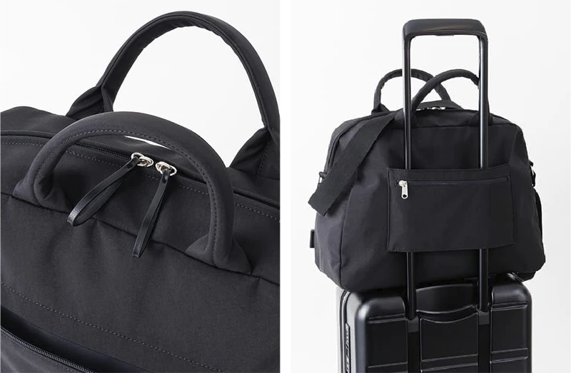 金具パーツを目立ちにくく、ナチュラルな仕上がりを意識したボストンバッグ。開閉が“らく”なループ状の引き手。雨の日でもお手入れ も“らく” な撥水加工。スマホの出し入れが “らく” なポケット付き。キャリーオンベルトは幅があるので、スーツケースにもしっかり取り付けられる。20Lの容量で1泊2日の旅行や普段使いにもおすすめ。