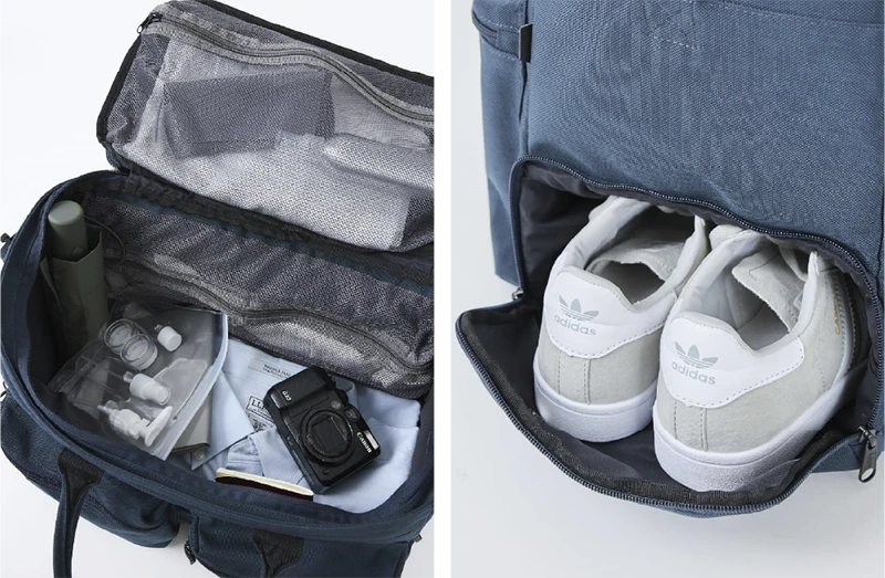 ボックスシルエットのボストンバッグ。メイン収納は大きく開く仕様で、荷物の整理もしやすく、サイドにはスニーカーも入る大きなポケットがあるので、旅行だけでなく、ジムやスポーツなど趣味用のバッグとしても使いやすい。荷物が少なくても型崩れせず、自立する設計なので、いつでもスタイリッシュに持つことができます。