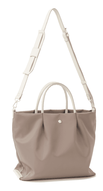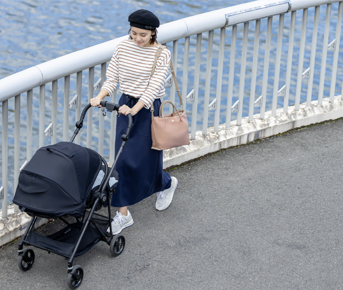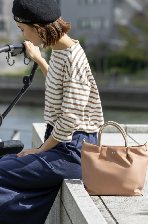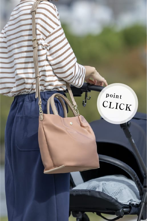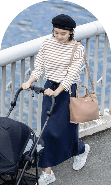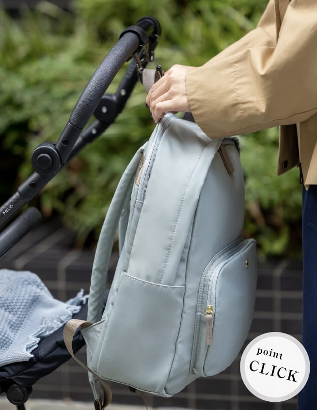 マザーズバッグには、両手が空くことは必須。とっさの抱っこなど、身体の負担は大きいもの。バッグだけでも軽量に、そして汚れてもさっと拭けるのも高ポイント。