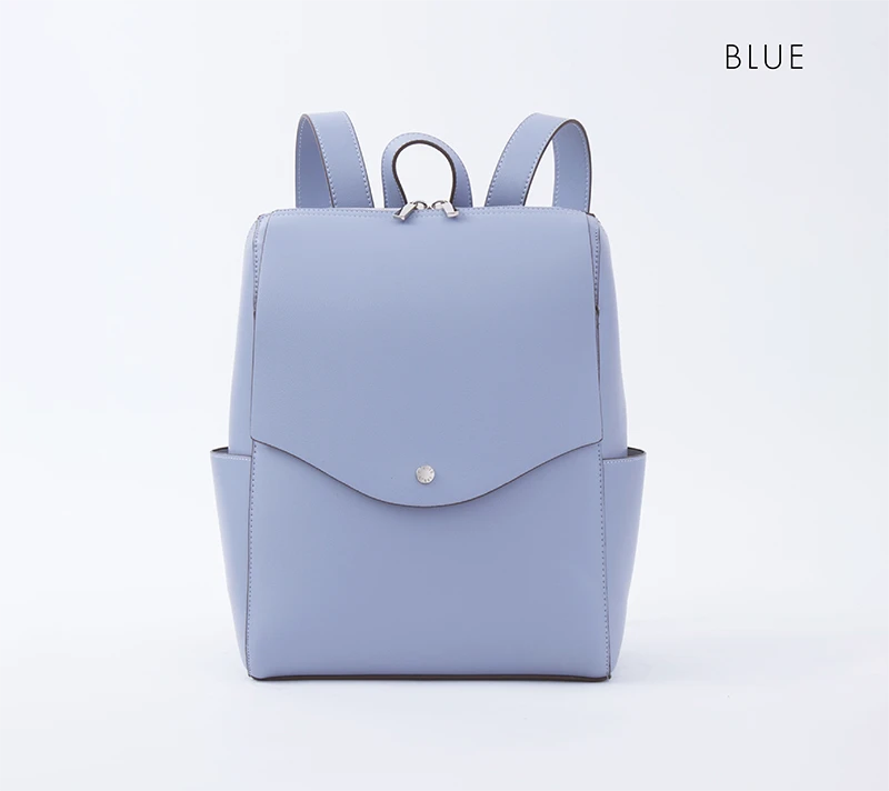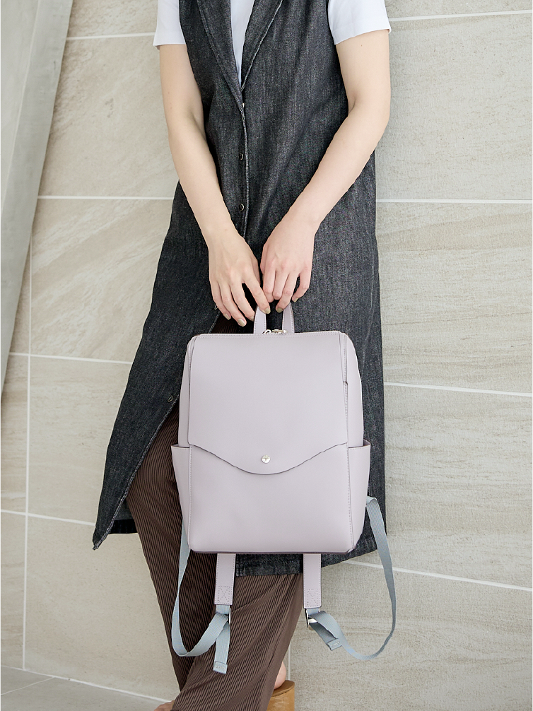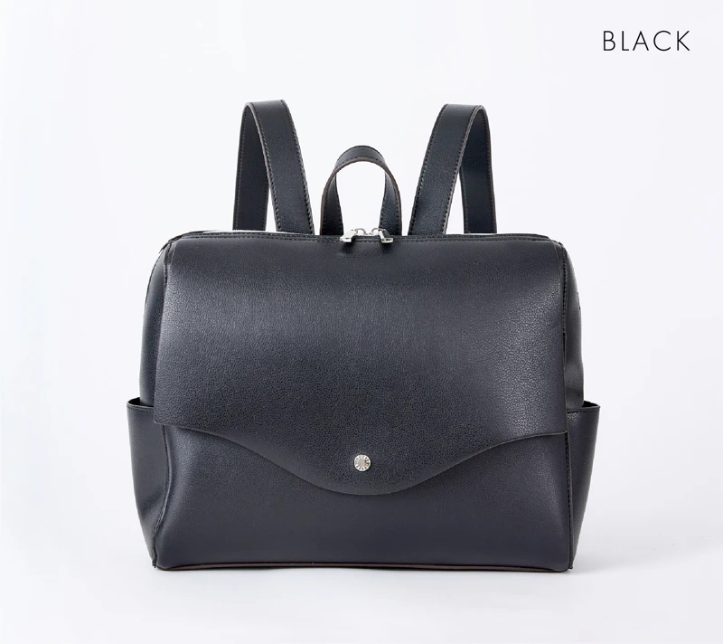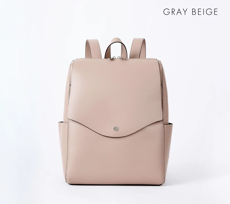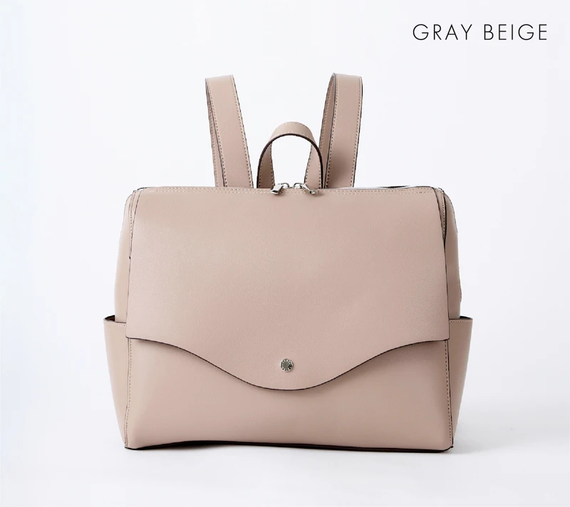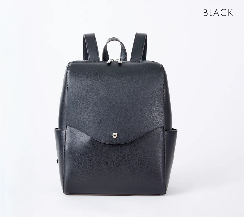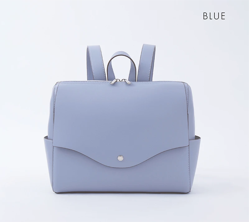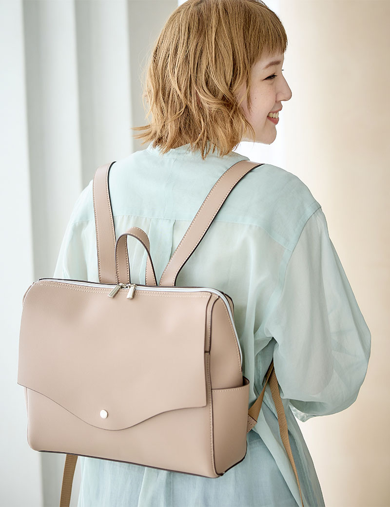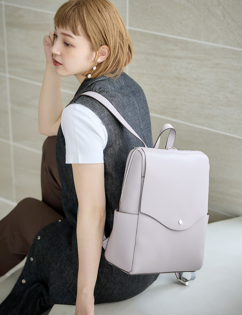 深さが縦型と比べて浅く、中身の見やすさがポイント。フラップポケットのボタン部分のカーブがかわいく、実用的な横型リュック。