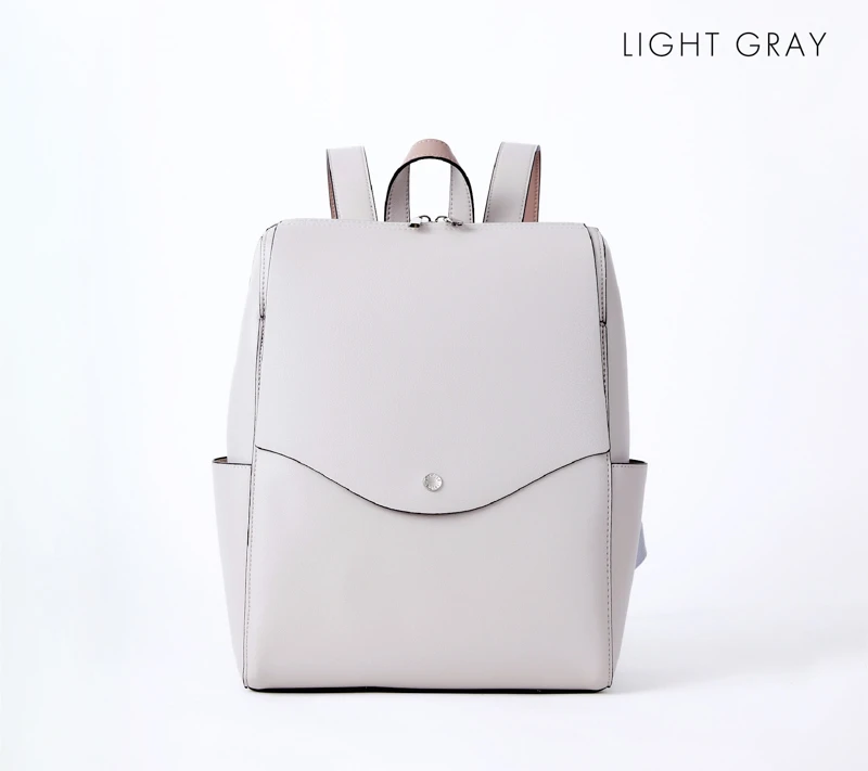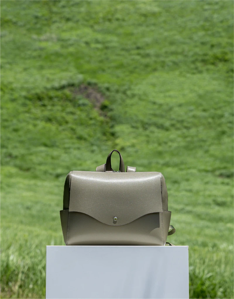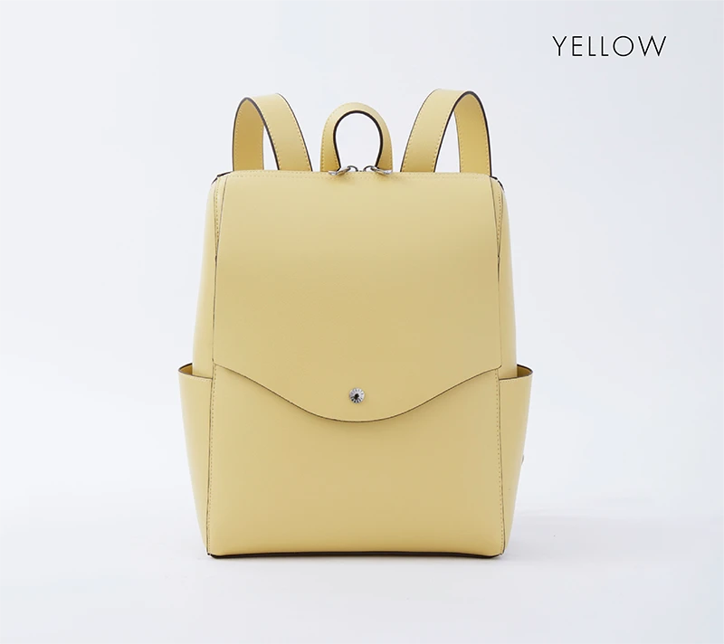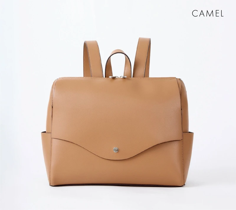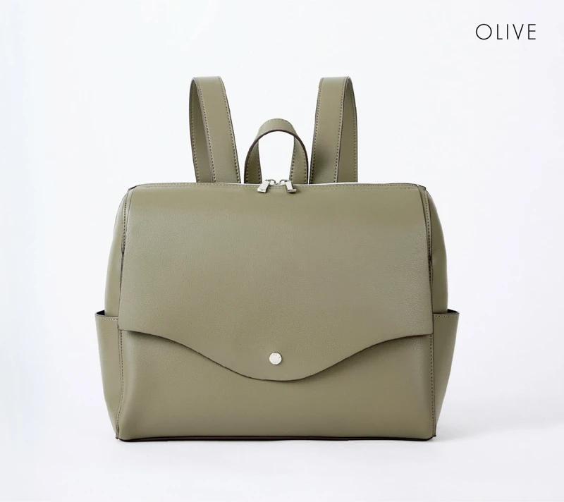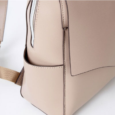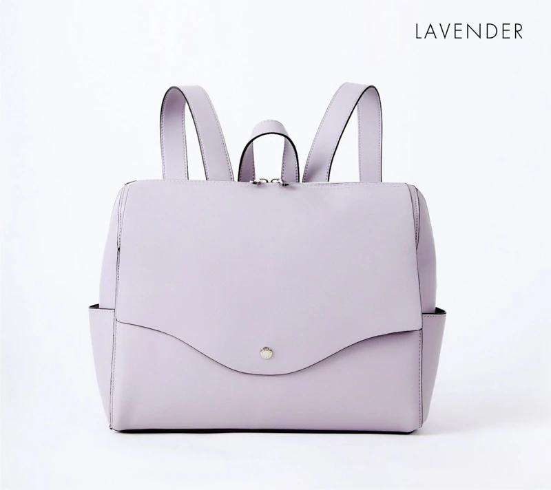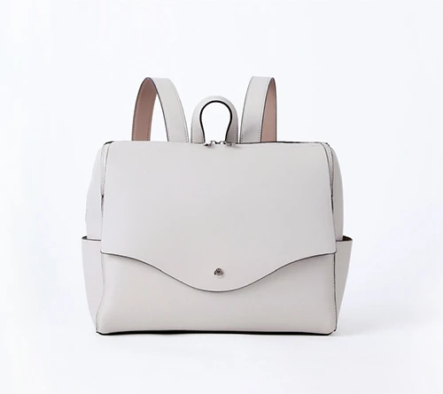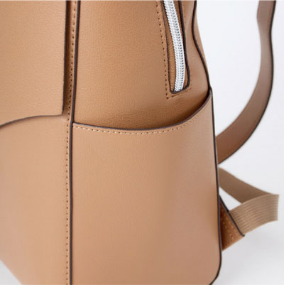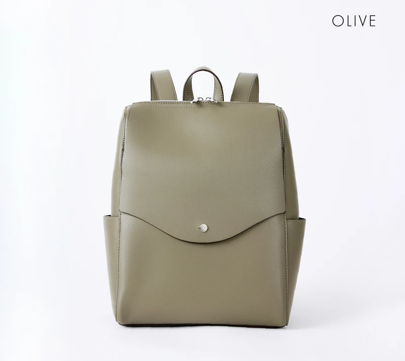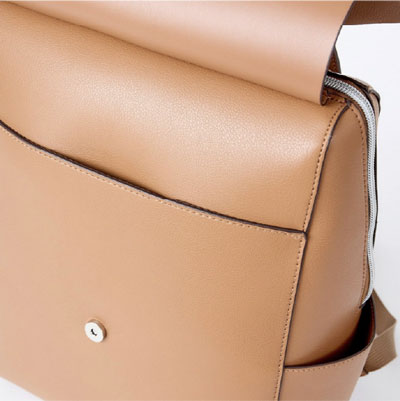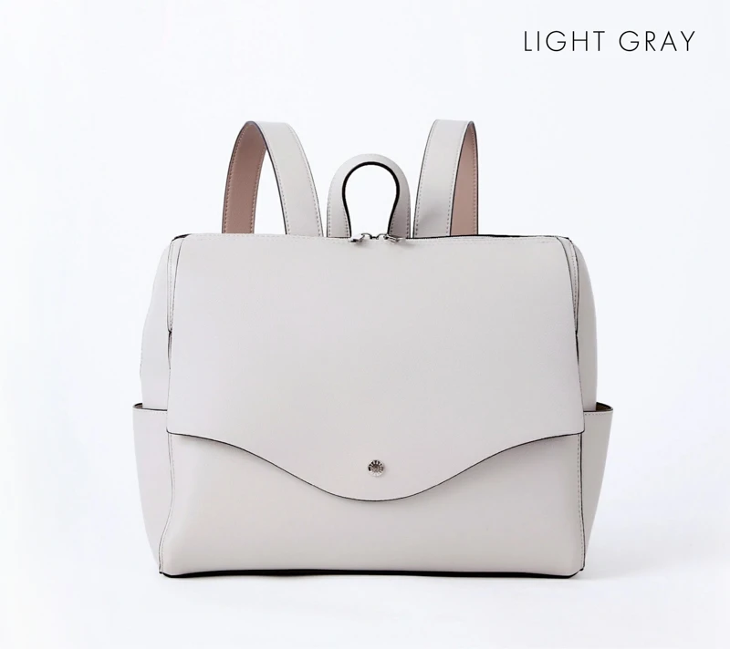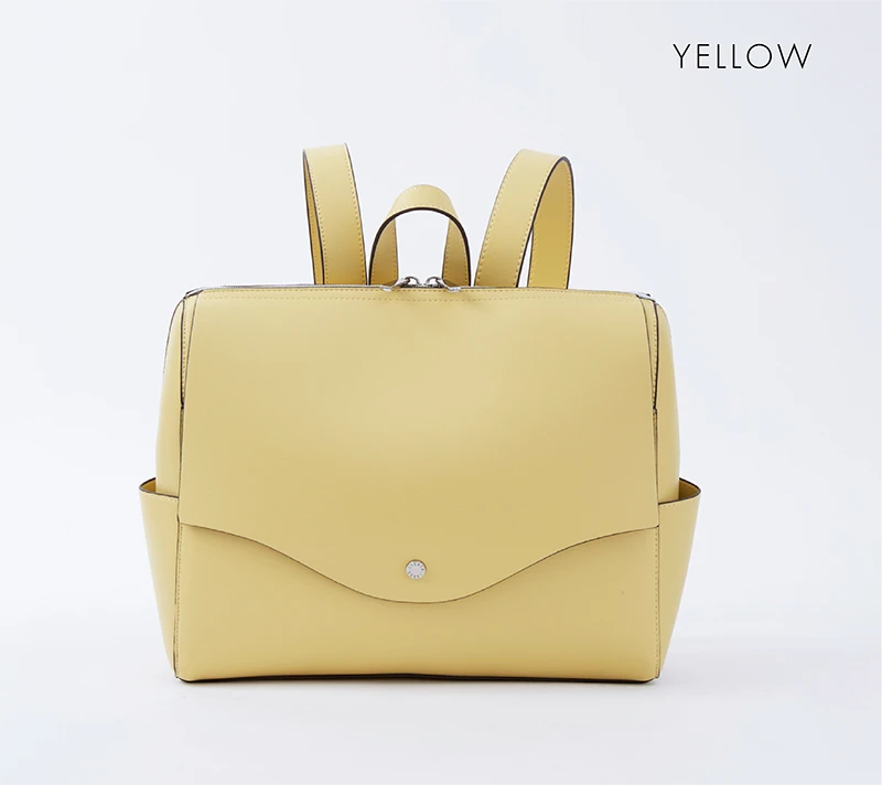 深さが縦型と比べて浅く、中身の見やすさがポイント。フラップポケットのボタン部分のカーブがかわいく、実用的な横型リュック。