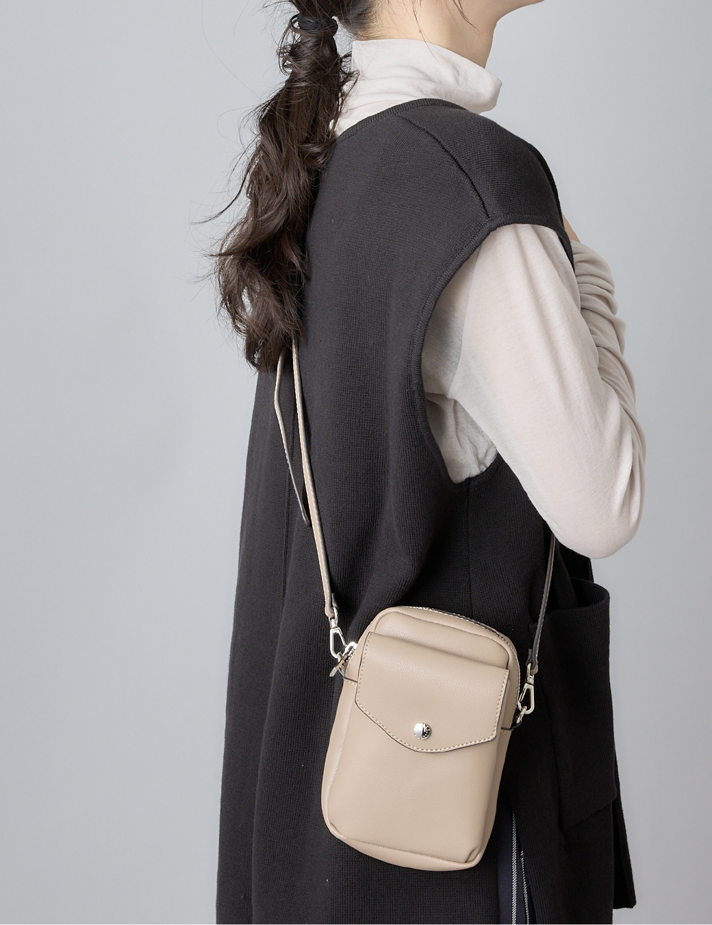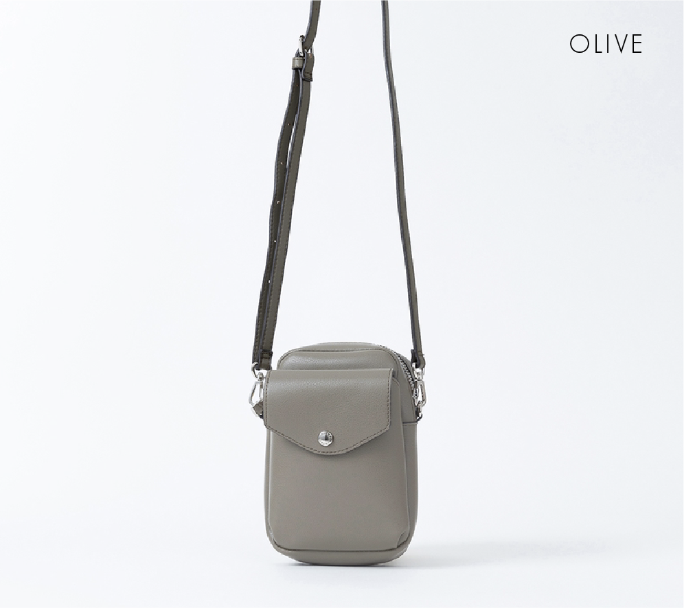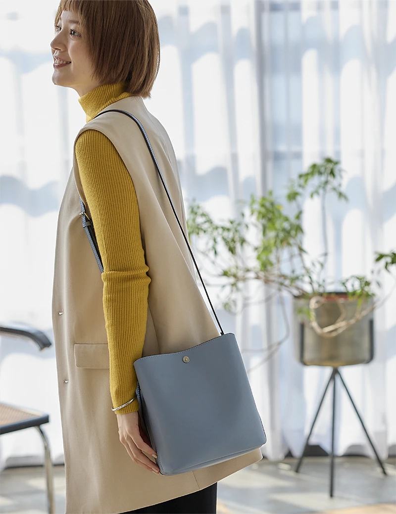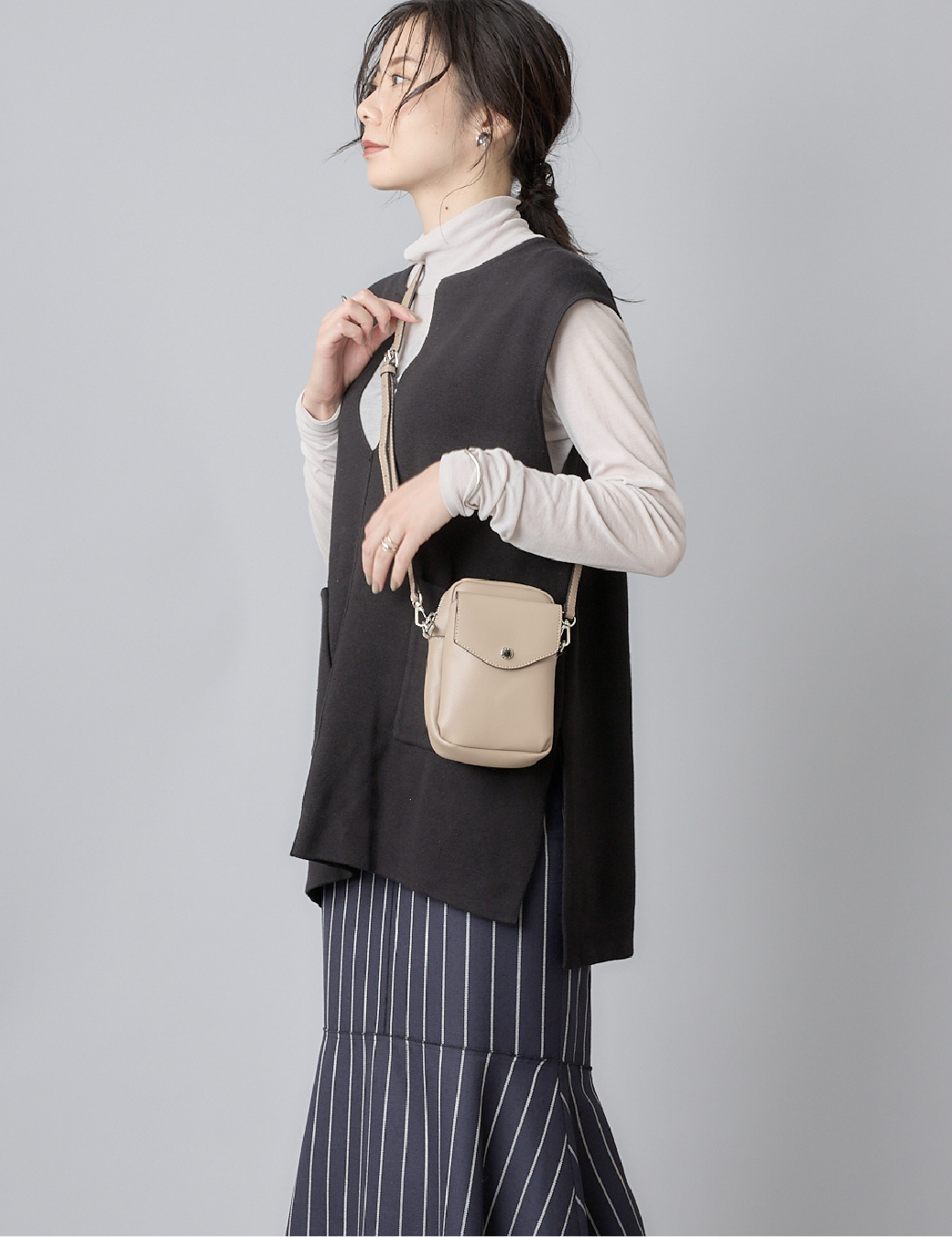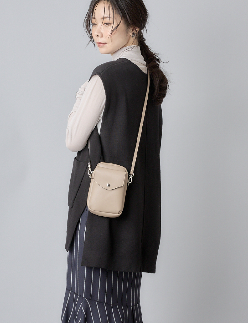 すっきりとシンプルな見た目の縦型ショルダーバッグ。3つ口の開口部が仕分けしやすい点もポイント。