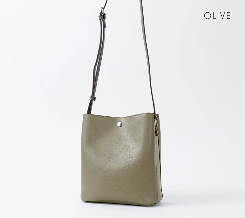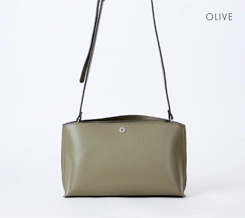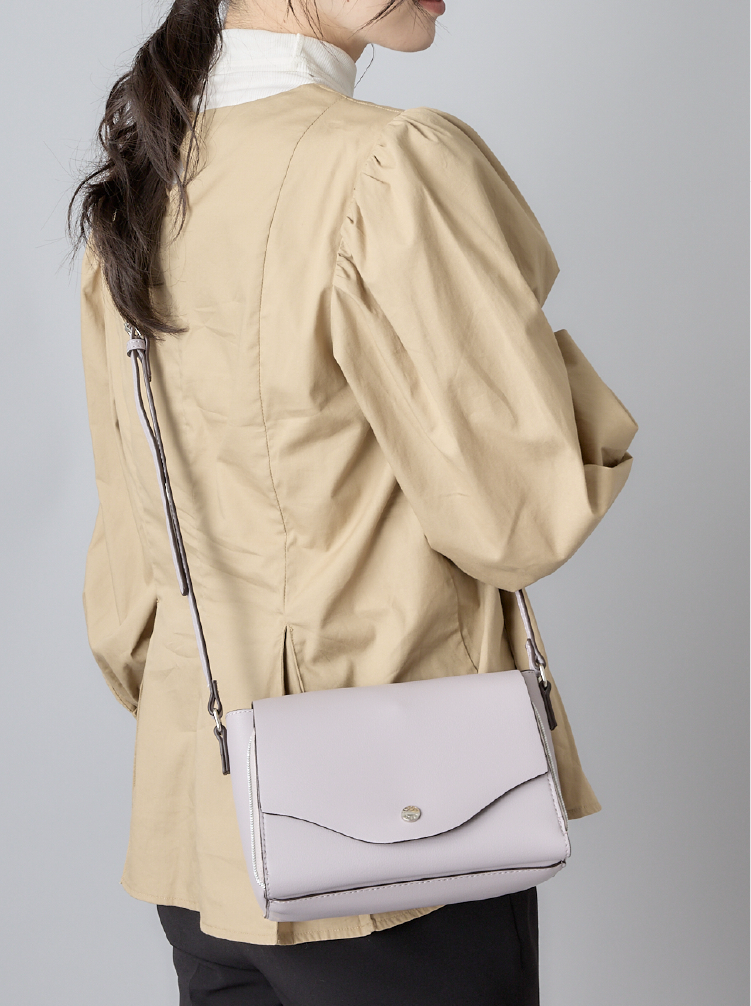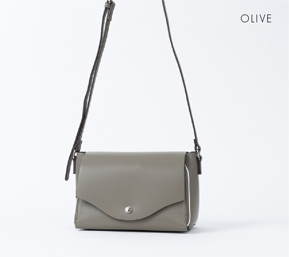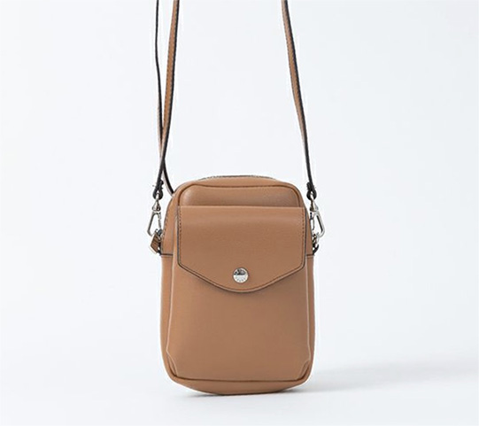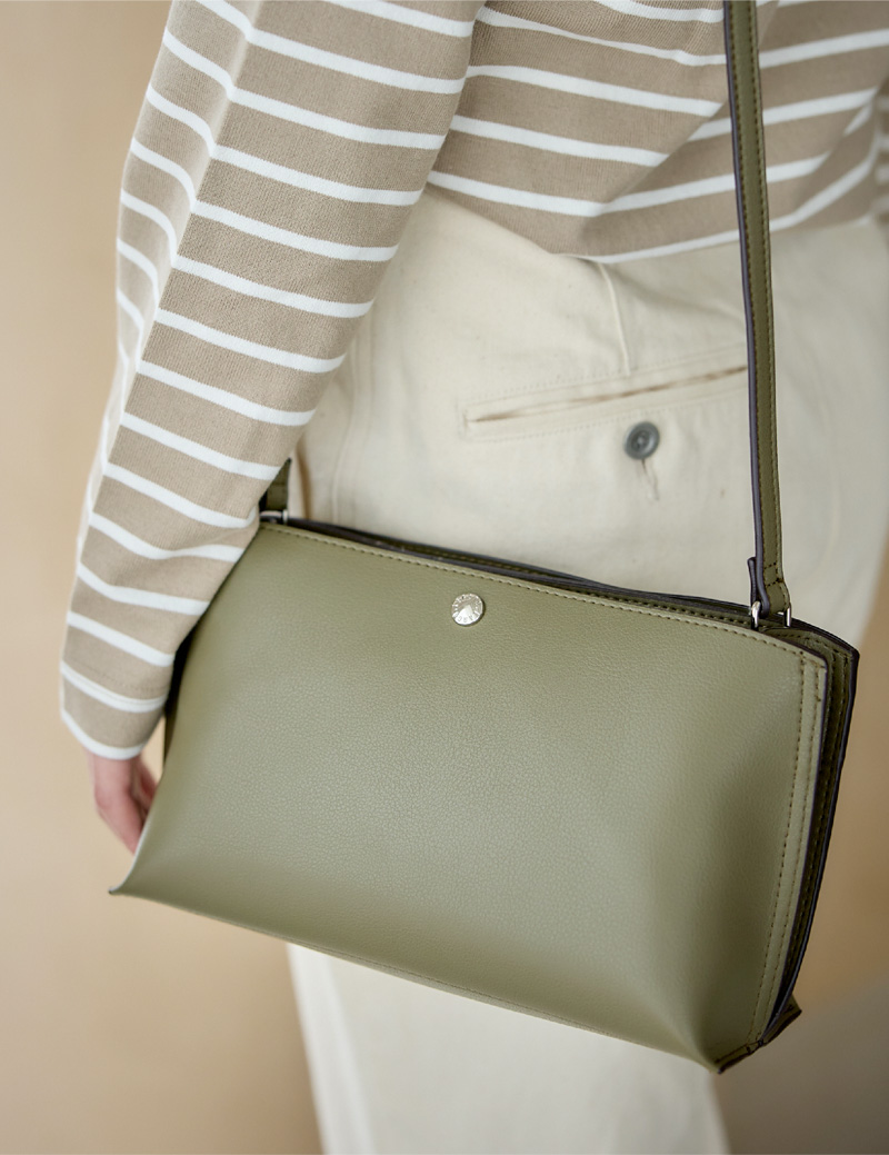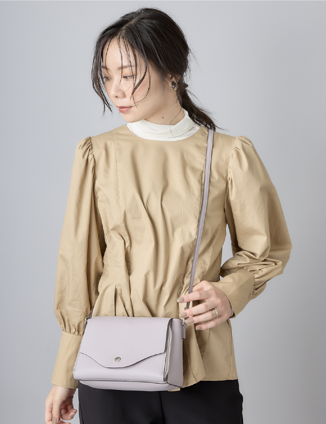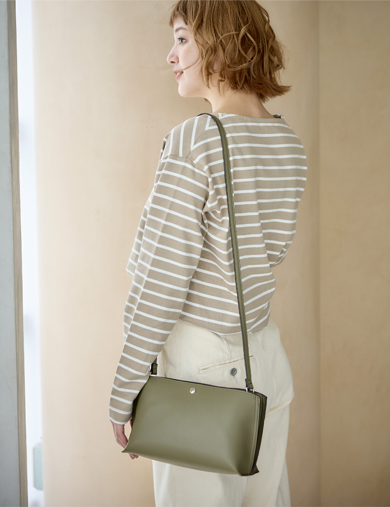 すっきりとシンプルな見た目の縦型ショルダーバッグ。3つ口の開口部が仕分けしやすい点もポイント。