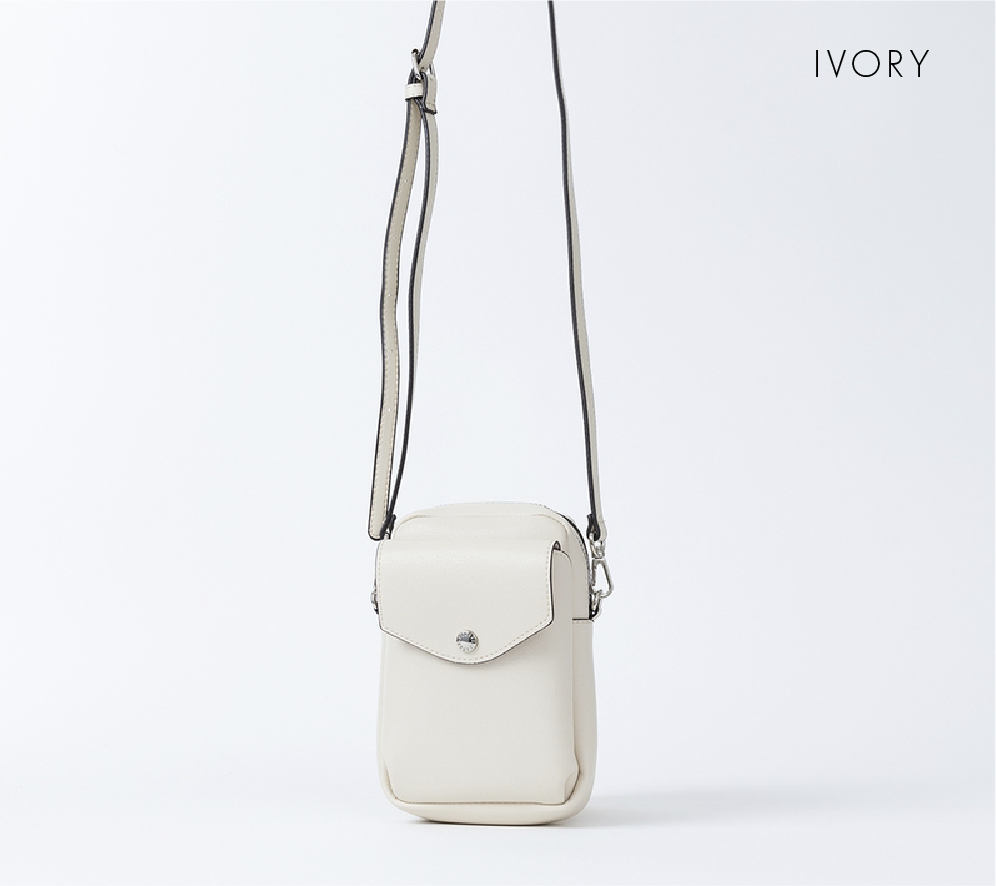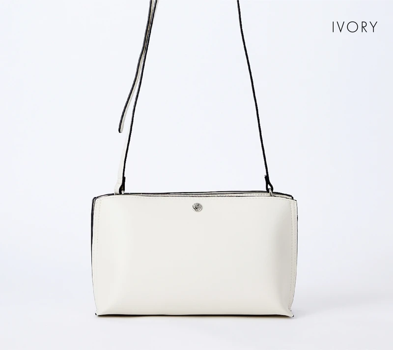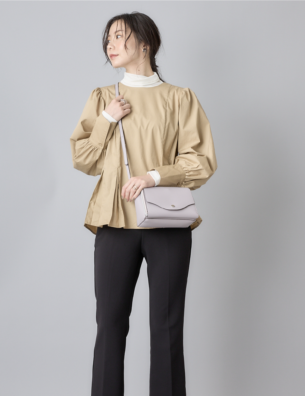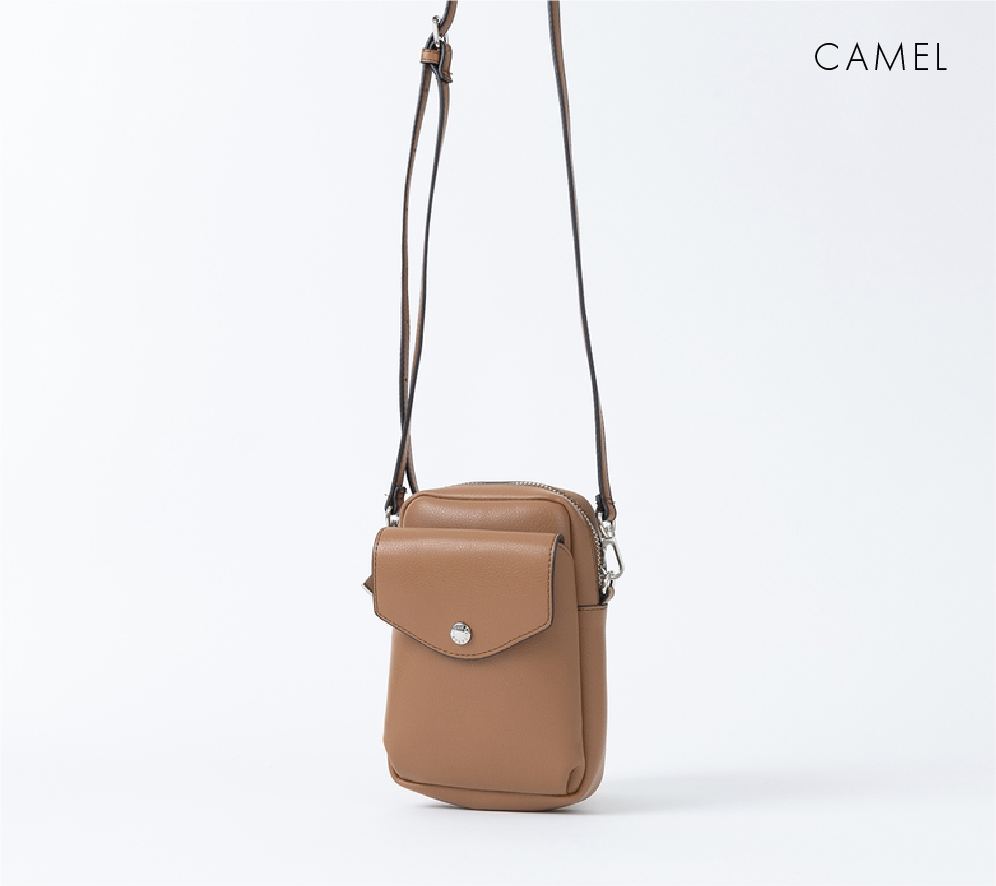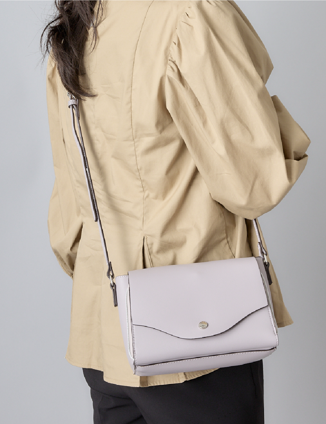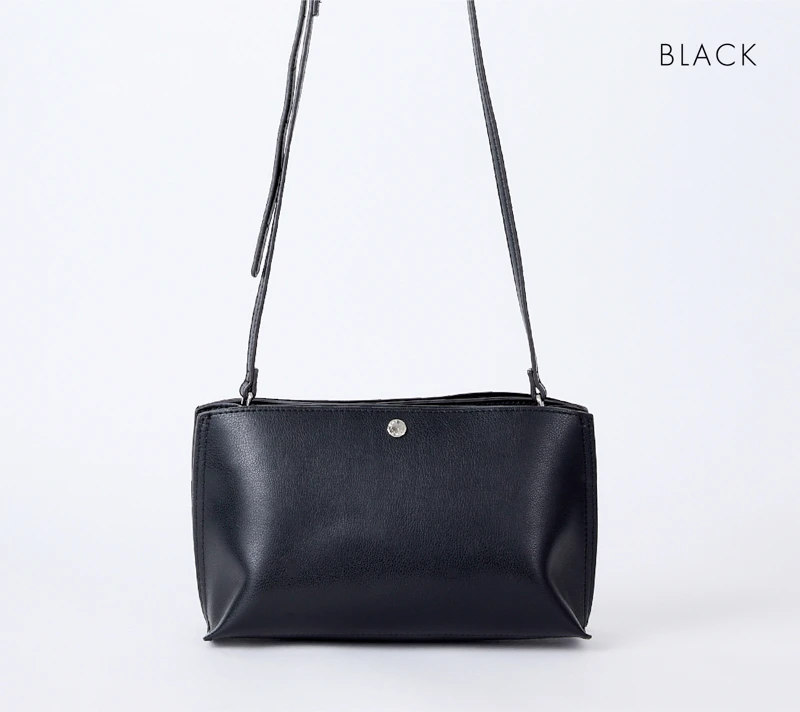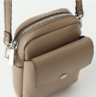 すっきりとシンプルな見た目の縦型ショルダーバッグ。3つ口の開口部が仕分けしやすい点もポイント。