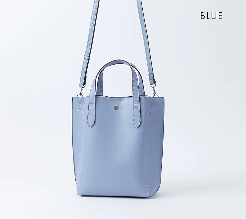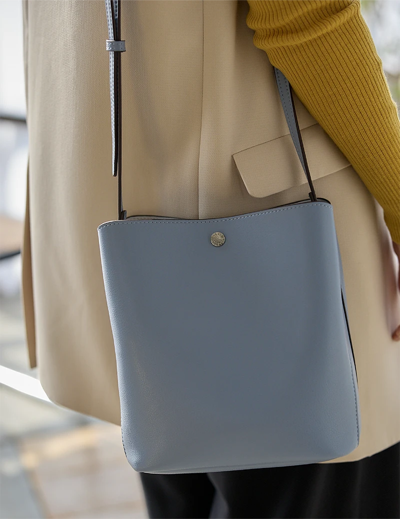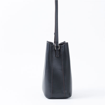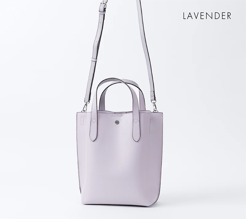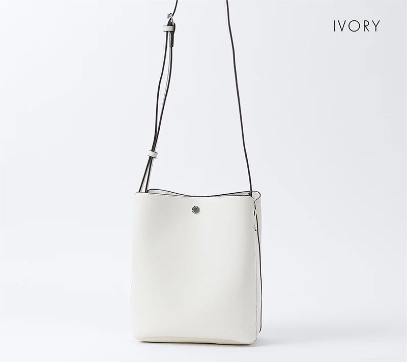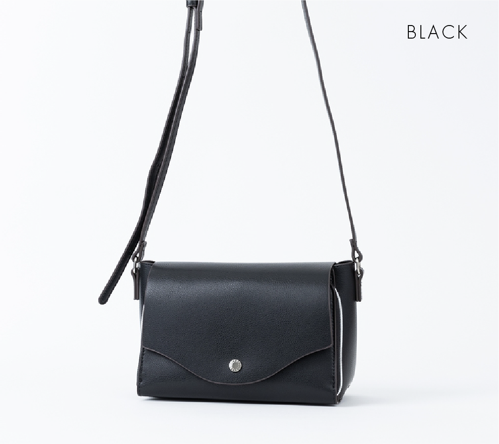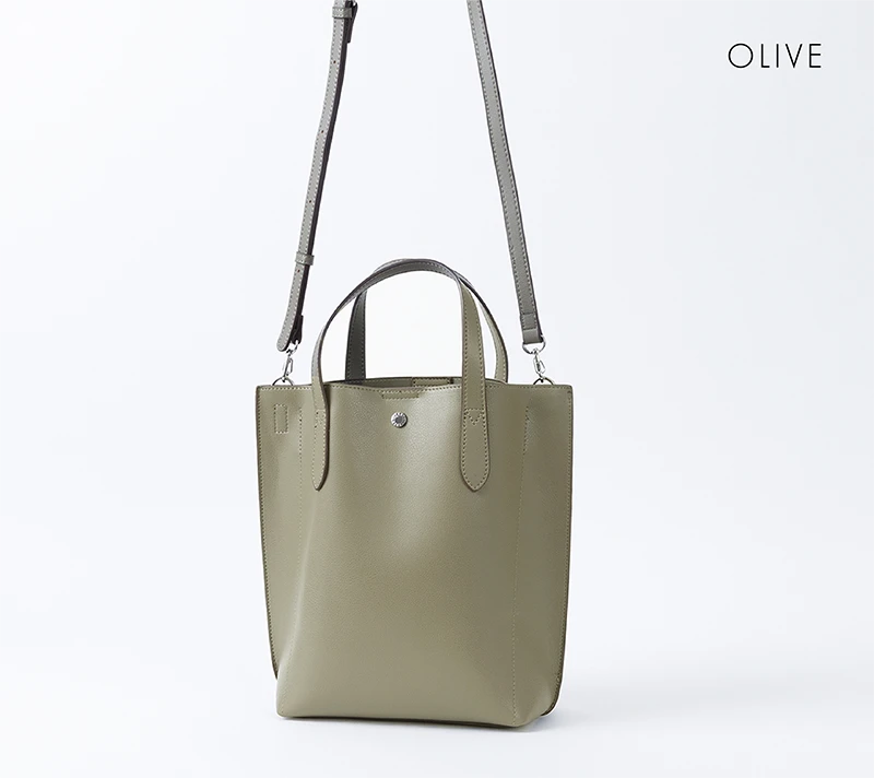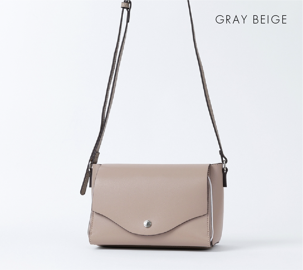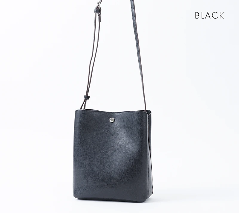 すっきりとシンプルな見た目の縦型ショルダーバッグ。3つ口の開口部が仕分けしやすい点もポイント。
