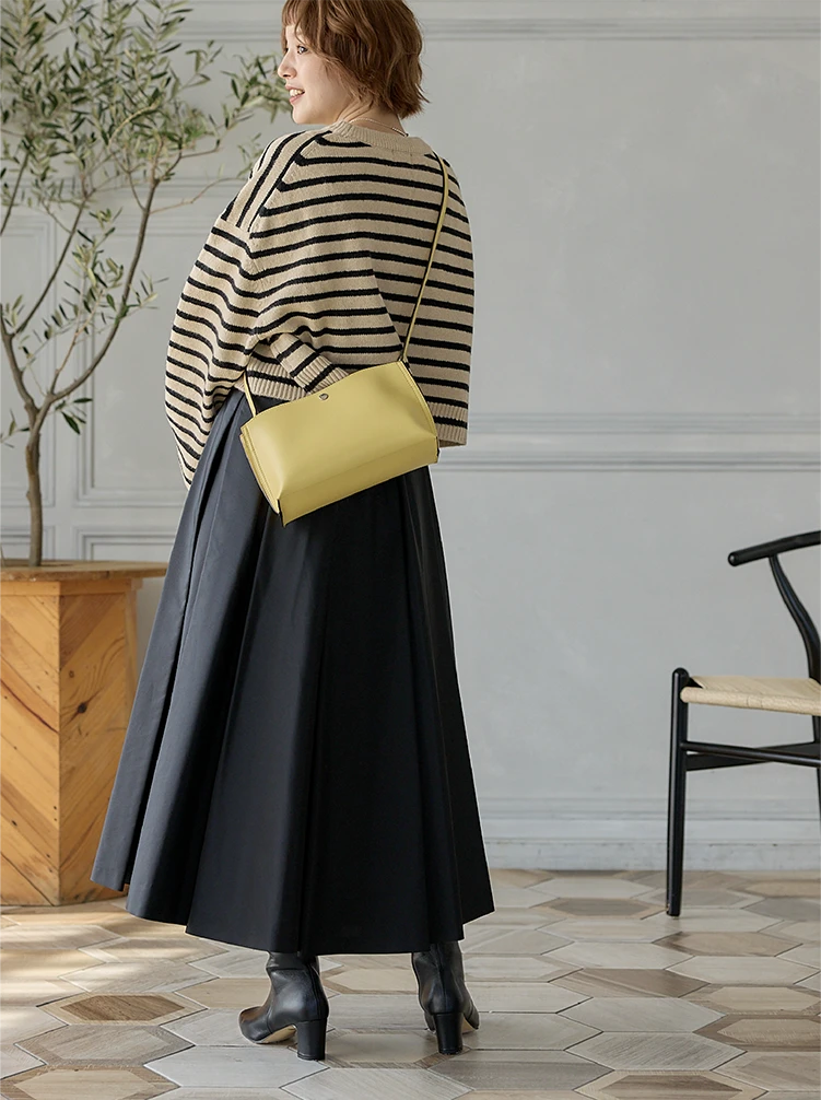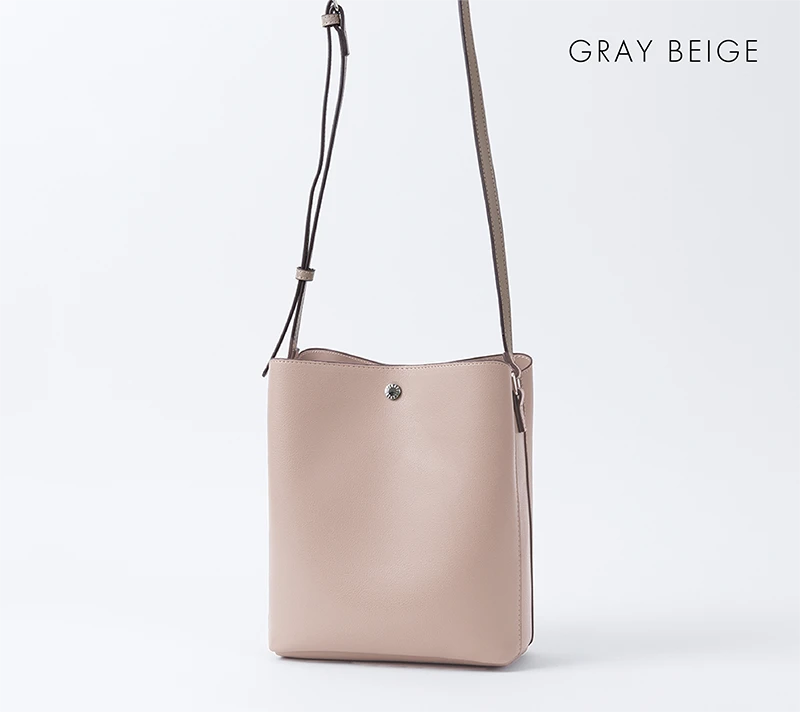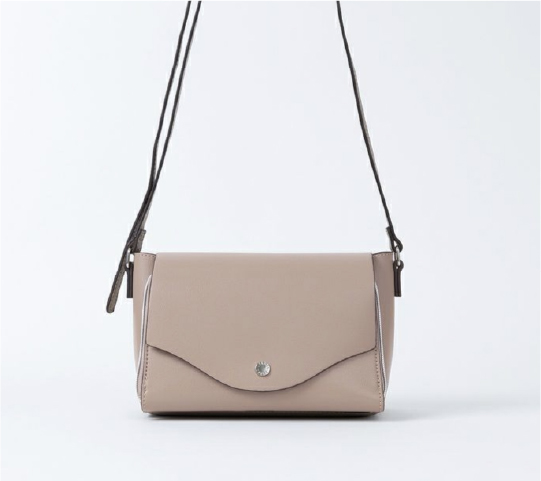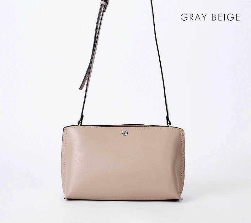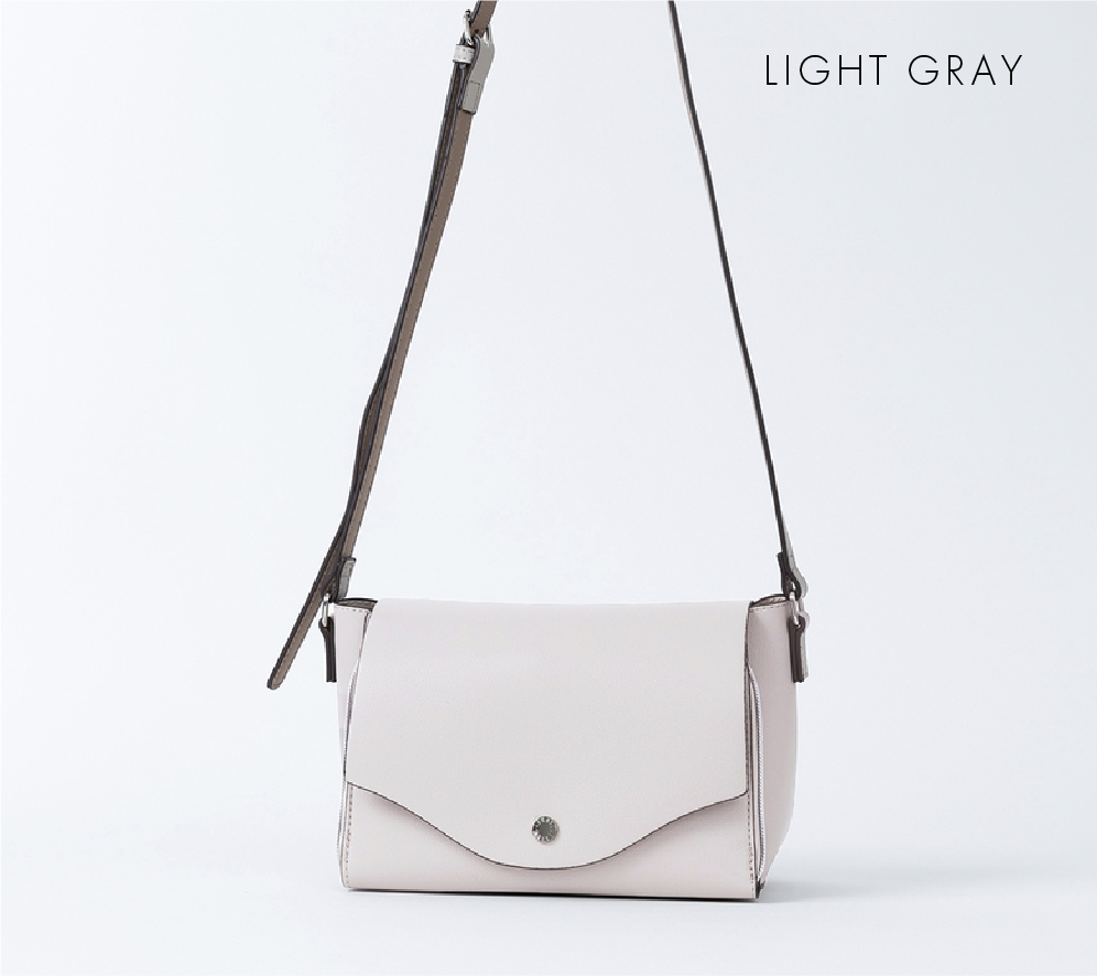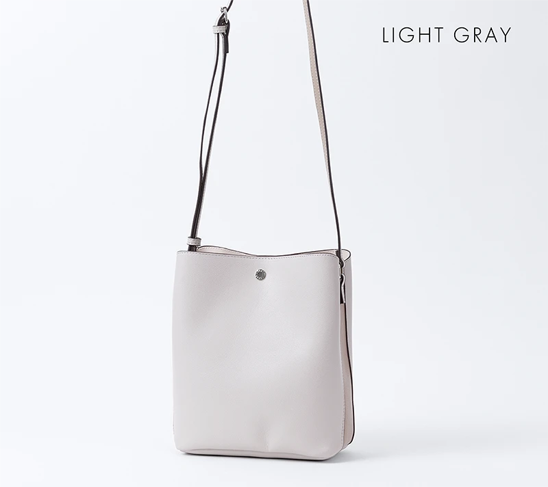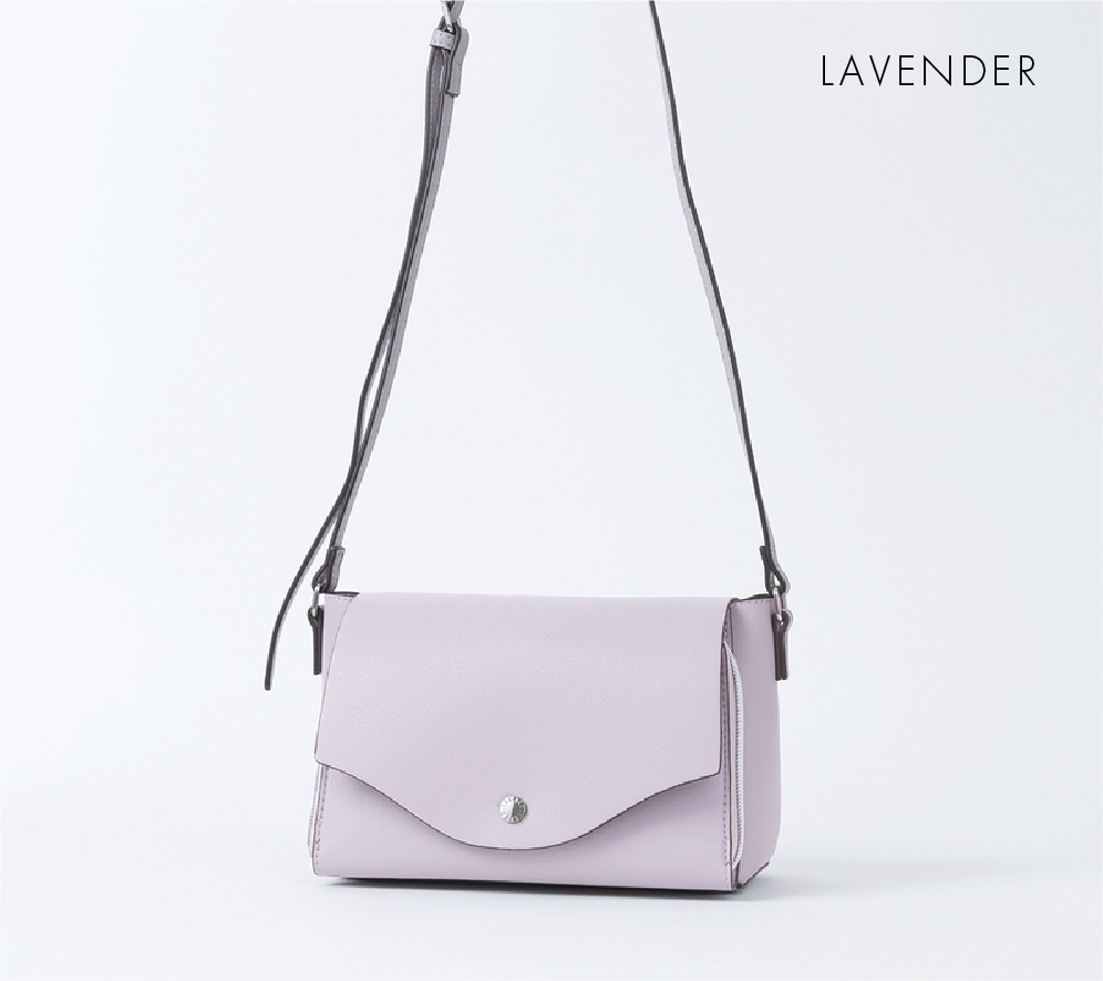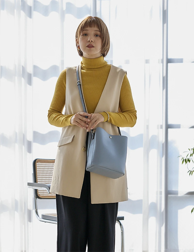すっきりとシンプルな見た目の縦型ショルダーバッグ。3つ口の開口部が仕分けしやすい点もポイント。