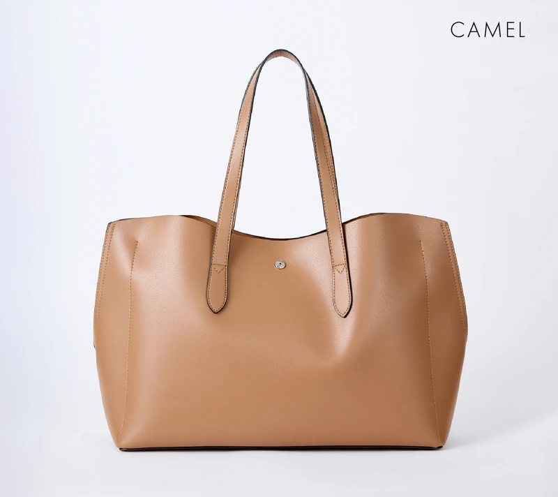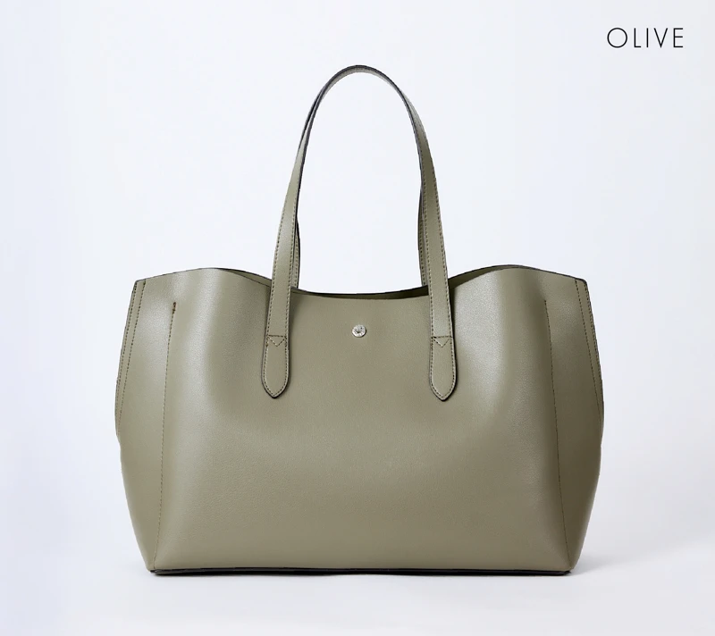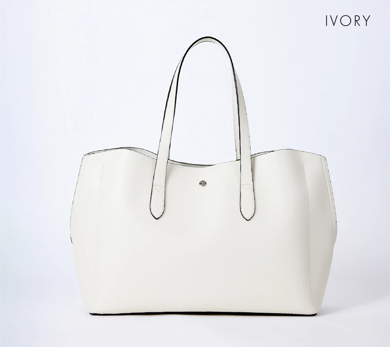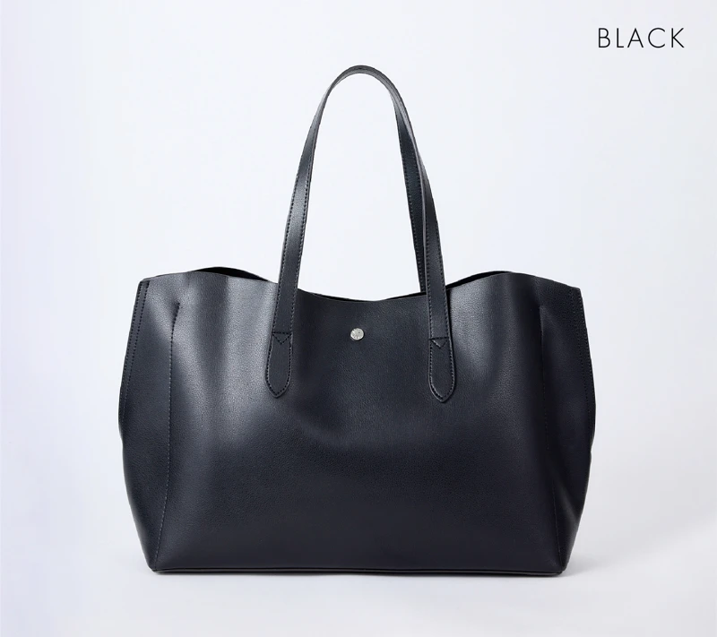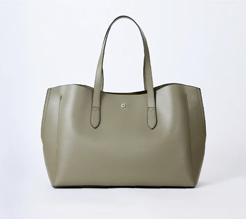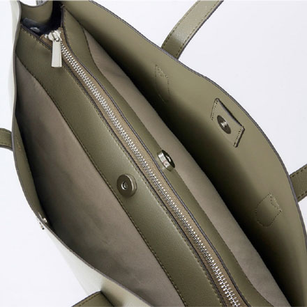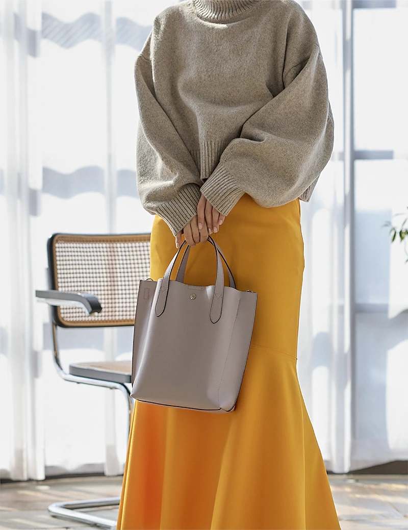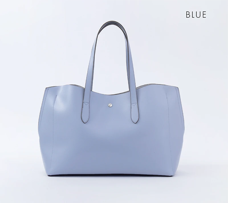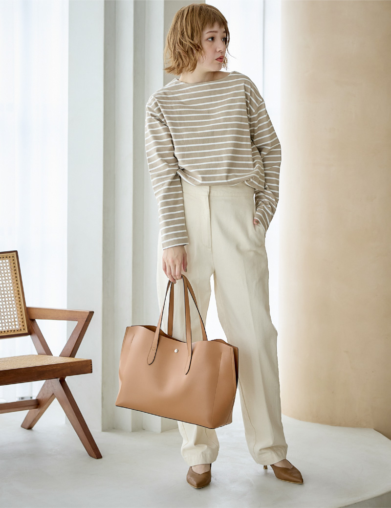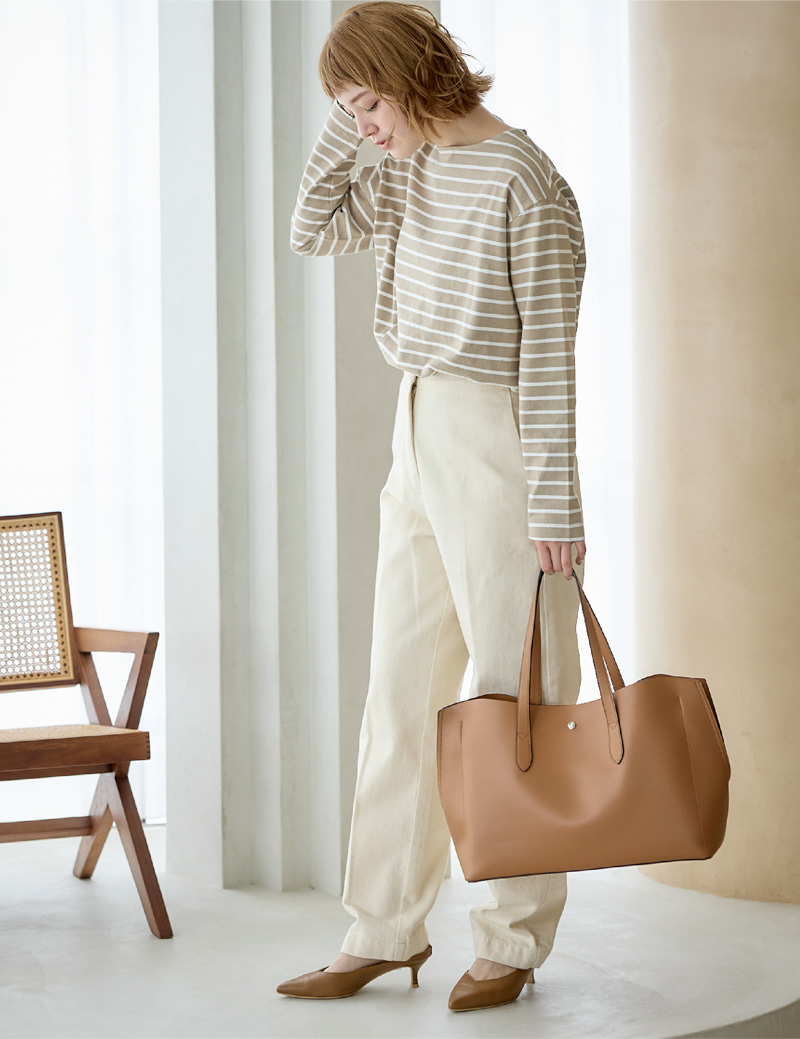 しっかりとしたマチがあり、A4ファイルも数冊入るサイズ感。柔らかすぎずハリのある生地で、肌なじみの良さもポイント。